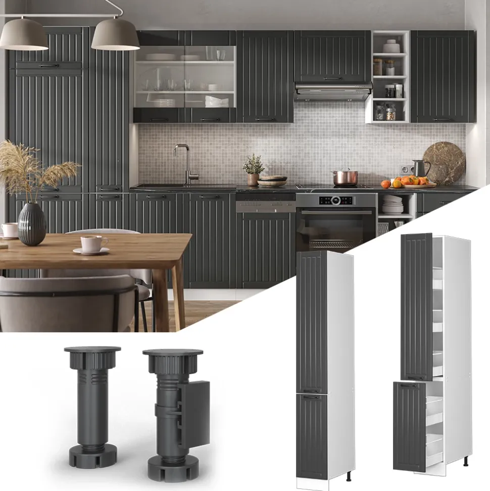 Die hochwertigen Softclose-Scharniere bieten ein bequemes Handling und die erstklassigen Metallauszüge der Schubladen sorgen für eine lange Lebensdauer der Küchenmöbel. Die Schränke sind mit höhenverstellbaren Stellfüßen, dank denen sich Bodenunebenheiten mühelos ausgleichen lassen, ausgestattet.