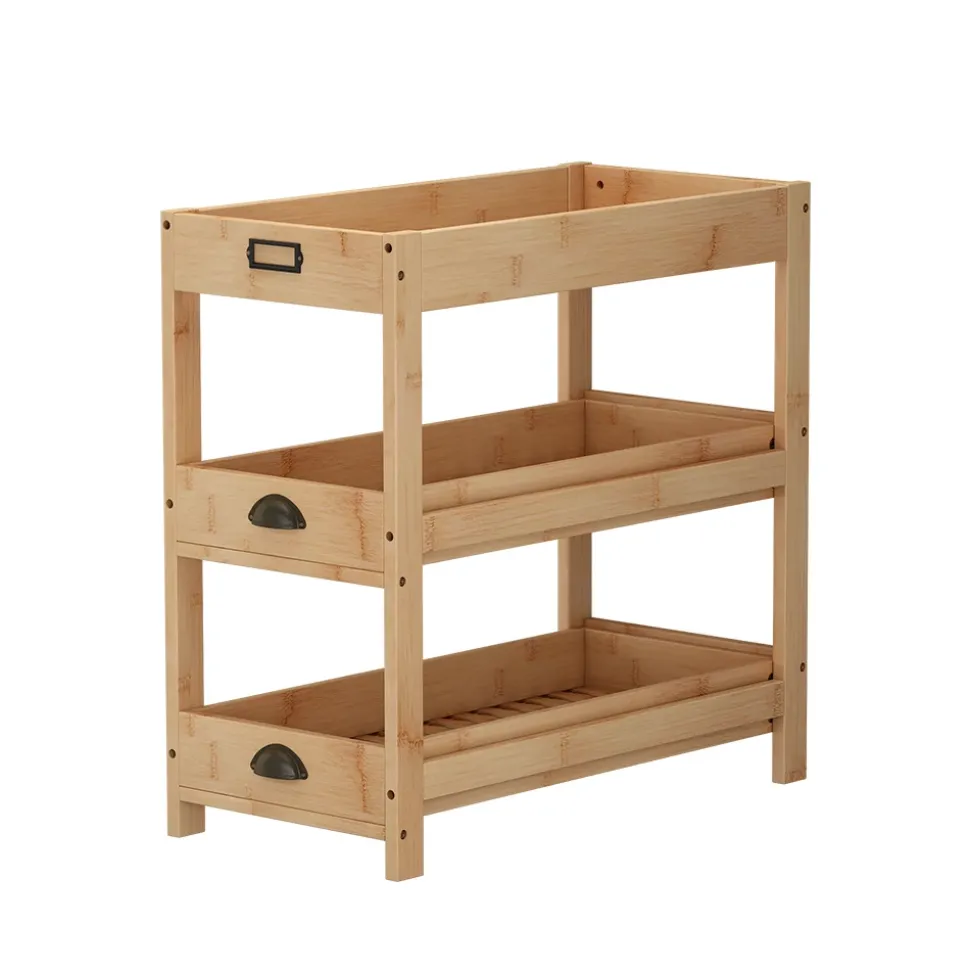 - Dank zweier Regalauszüge bietet das Stauraumregal viel Platz und überzeugt mit stilvollen Griffen sowie der Etiketten-Halterung. Ein Möbelstück für praktischen und ansprechenden Stauraum.