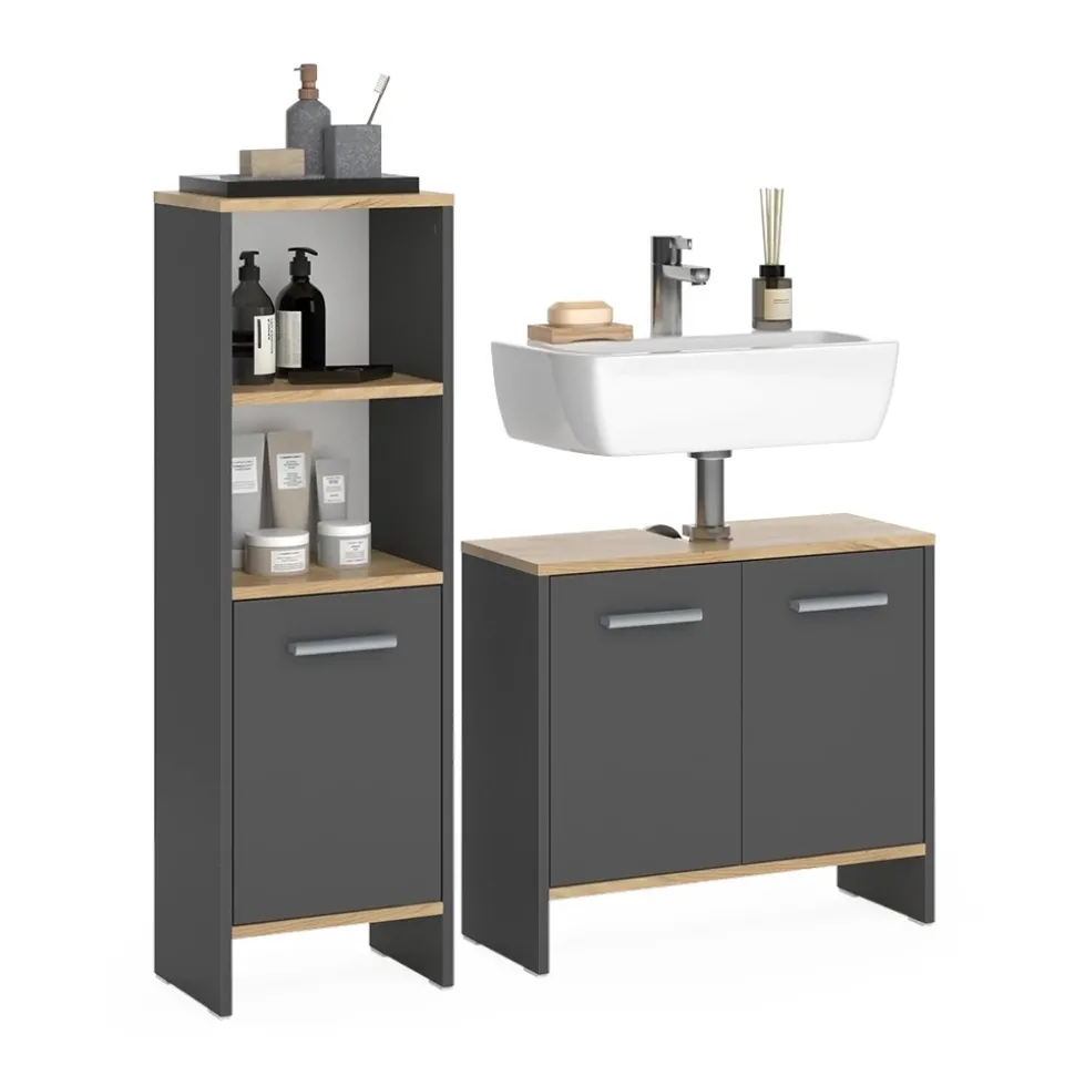 Das Badezimmermöbel-Set „Karli“ ist die perfekte Lösung für alle, die ihr Badezimmer stilvoll und funktional gestalten möchten. Das Ensemble besteht aus einem geräumigen Waschbeckenunterschrank und einem praktischen Hochschrank, die für ausreichend Stauraum sorgen. Mit „Karli“ wird Ihr Badezimmer zu einer Wohlfühloase, in der Sie sich entspannen und erfrischen können. Lassen Sie sich von dem zeitlosen Design und der hochwertigen Verarbeitung überzeugen und verwandeln Sie Ihr Badezimmer in einen Ort der Ruhe und Entspannung. Gönnen Sie sich das Badezimmer, das Sie verdienen – mit dem Badezimmermöbel-Set „Karli“.
