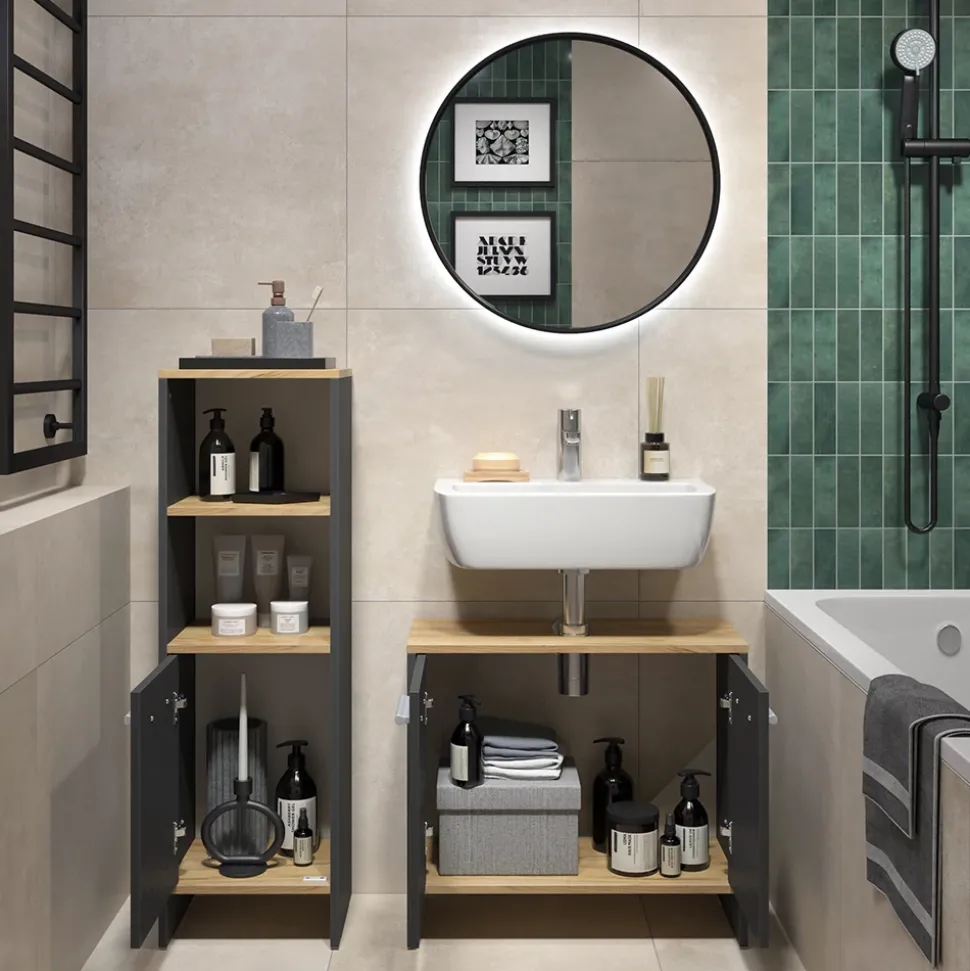 LIEFERUMFANG: Waschbeckenunterschrank, Hochschrank, Montageanleitung, Montagematerial (Dekoration nicht enthalten)