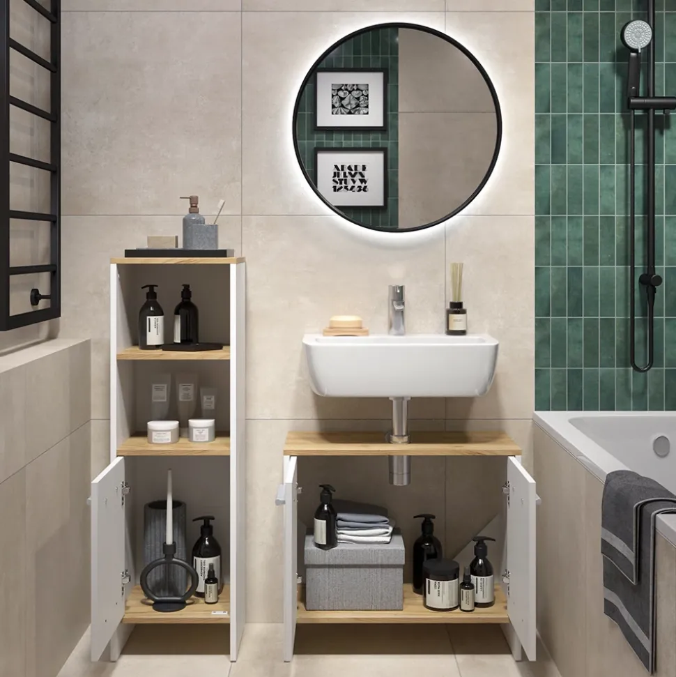 - LIEFERUMFANG: Waschbeckenunterschrank, Hochschrank, Montageanleitung, Montagematerial (Dekoration nicht enthalten)
