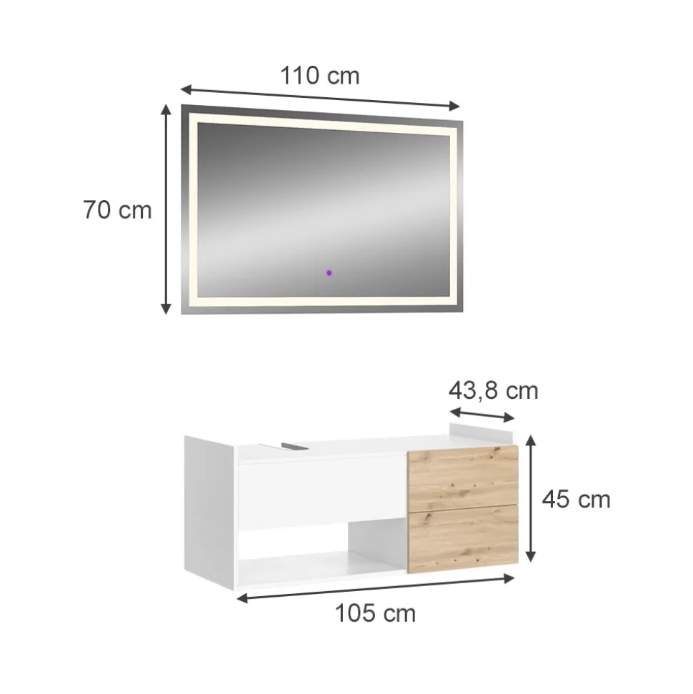 - PRODUKTMAßE: Der Waschtischunterschrank misst 105 x 45 x 43,8 cm (BxHxT) und wiegt 24,1 kg. Der LED-Spiegel ist 110 x 70 x 2,8 cm groß und wiegt 8,3 kg.