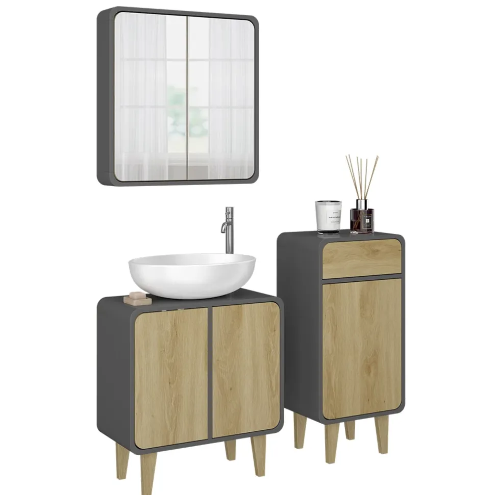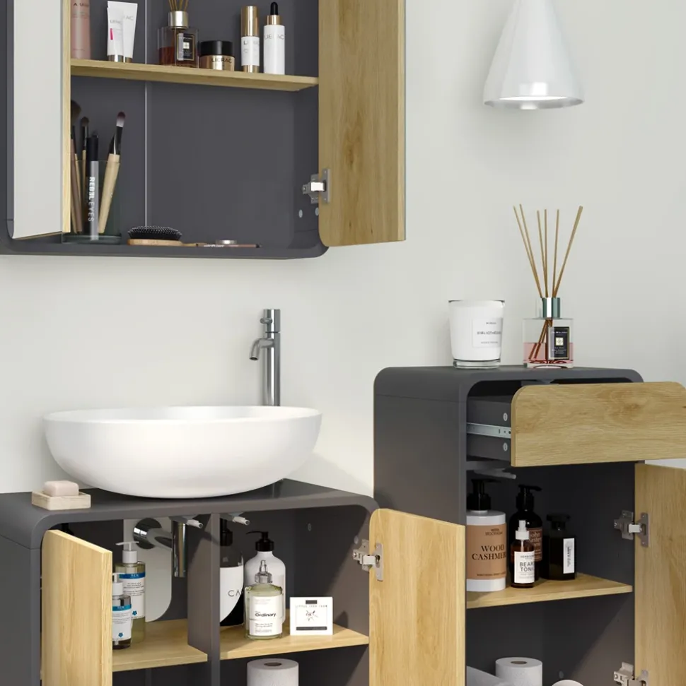 - Das Badezimmerschrank-Set bietet Stauraum für Pflegeprodukte und Handtücher, während das moderne Design eine stilvolle Ergänzung für Ihr Badezimmer darstellt.