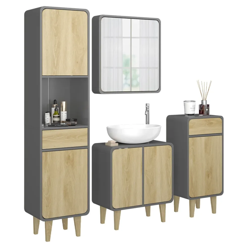- Das Badezimmerschrank-Set besticht durch sein modernes Design und seine hohe Funktionalität. Mit viel Stauraum und praktischen Ablageflächen ist es die perfekte Lösung für jedes Badezimmer.