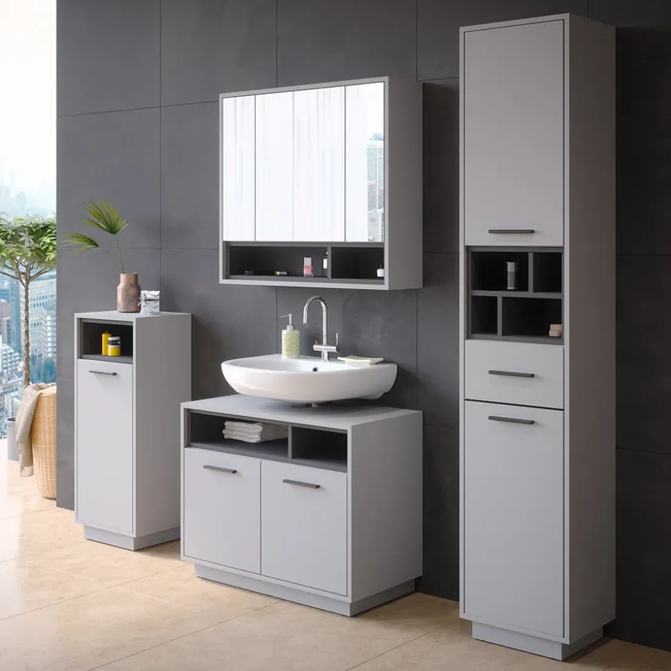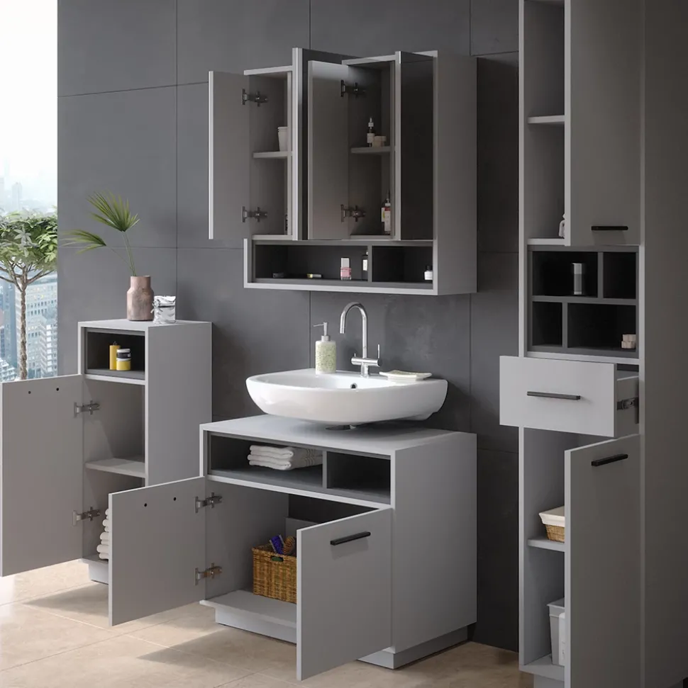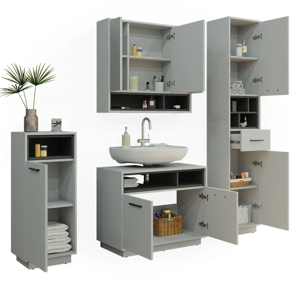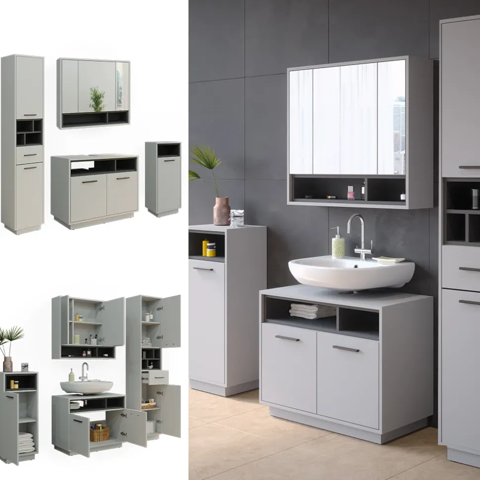 - Das Badezimmerschrank-Set bietet eleganten Stauraum und lässt sich mit anderen Sets der Serie kombinieren. Es ist die perfekte Wahl für jeden Badezimmerstil.