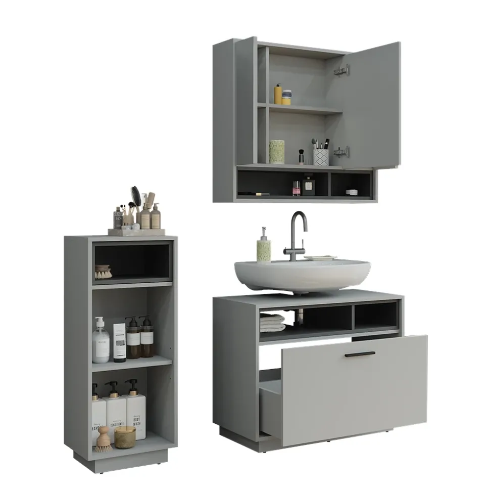 - Mit dem Set mit Waschbeckenunterschrank treffen Sie eine gute Entscheidung für Ihr Zuhause. Es bietet ausreichend Stauraum und passt universell in jede Wohnung.