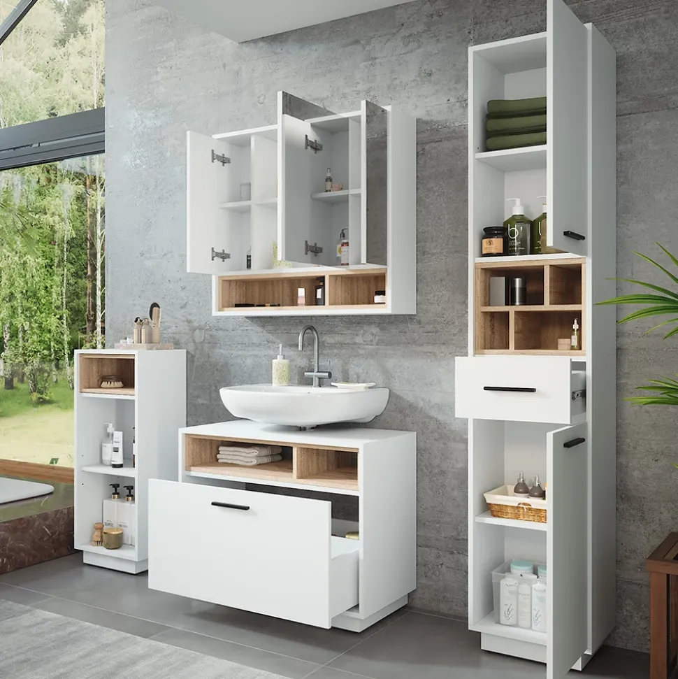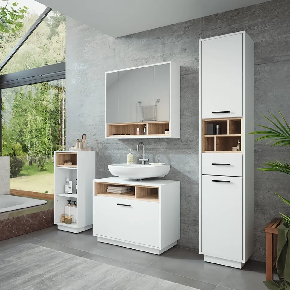 - LIEFERUMFANG: Waschbeckunterschrank, Spiegelschrank, Midischrank, Hochschrank, Montageanleitung, Montagematerial (Dekoration nicht enthalten)