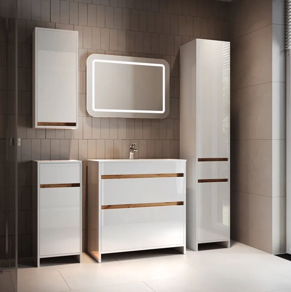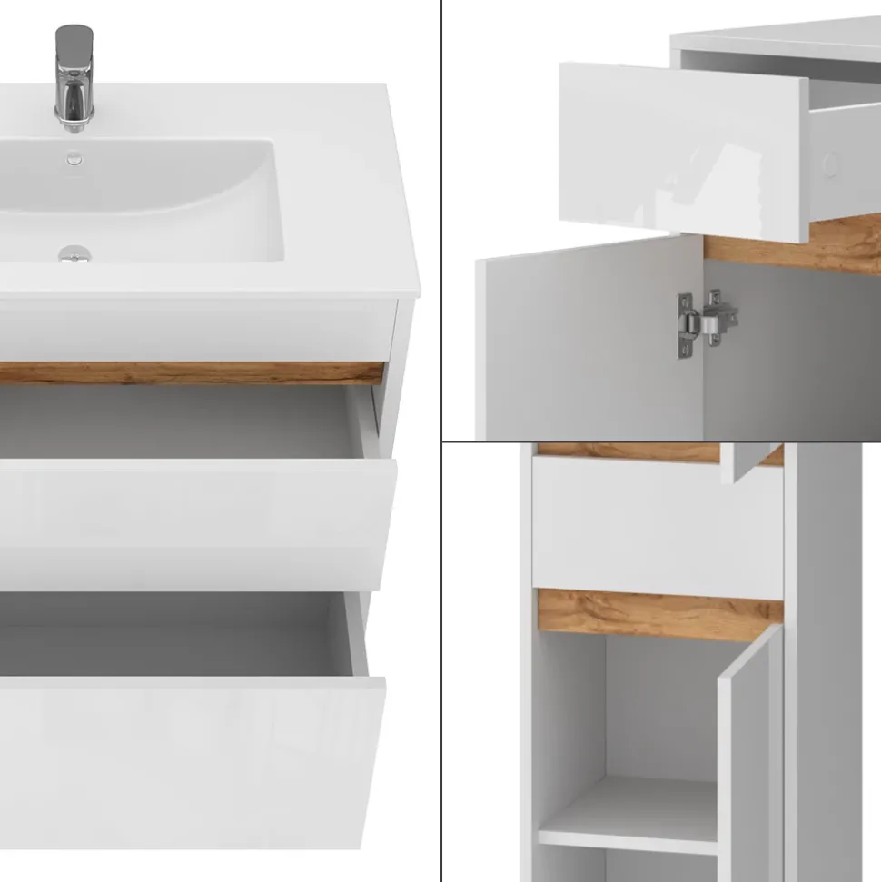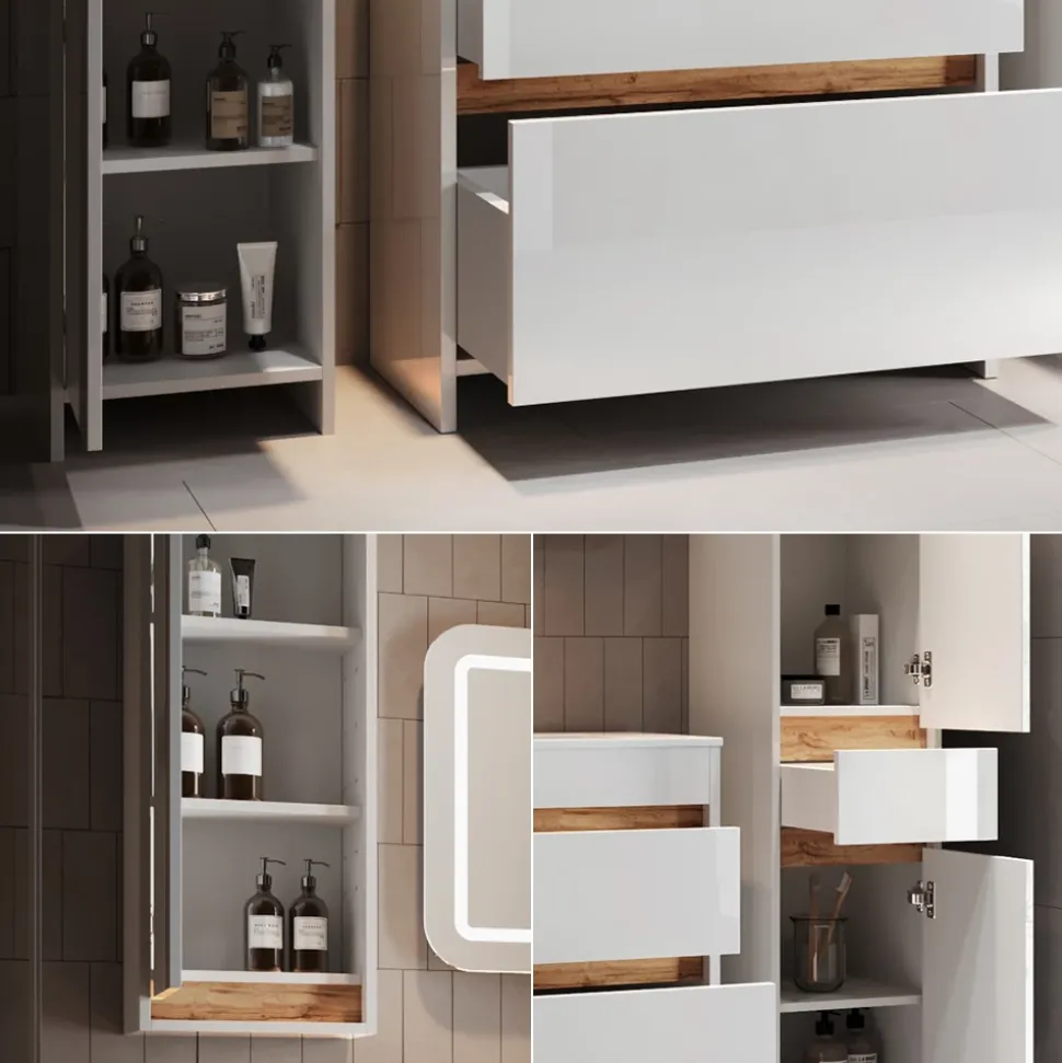 - LIEFERUMFANG: Waschbeckenunterschrank, Waschbecken, Hängeschrank, Hochschrank, Midischrank, Montageanleitung, Montagematerial.