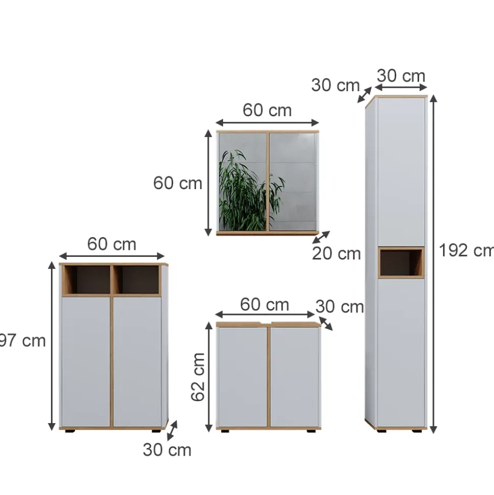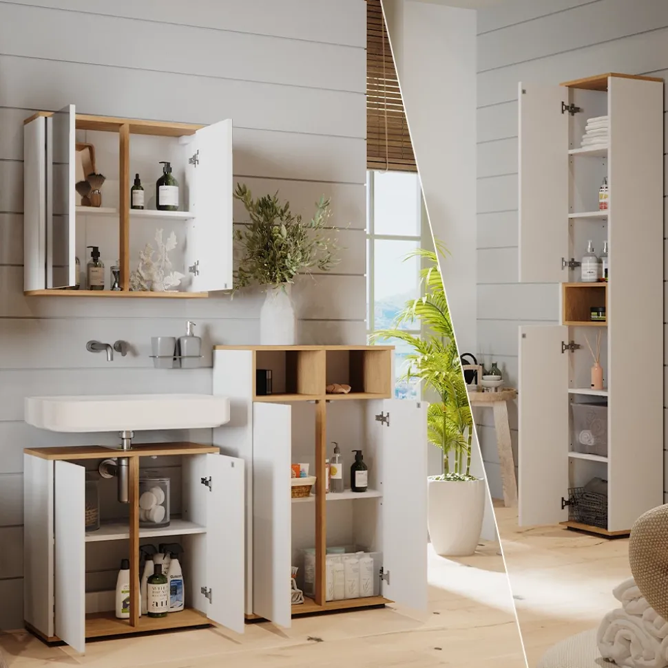 Das Badmöbel-Set Didi ist die perfekte Ergänzung für Ihr Badezimmer! Das Set besteht aus einem Waschbeckenunterschrank, einem Spiegelschrank, einem Hochschrank und einem Midischrank mit 2 Türen. Das innovative Design ist ein echter Hingucker und lässt sich perfekt in jedes Badezimmer integrieren. Dank der Push-to-open – Funktion lassen sich alle Schränke einfach öffnen und schließen. Der reichlich vorhandene Stauraum bietet Platz für alle Ihre Badutensilien. Das Badmöbel-Set Didi ist ein Muss für jeden, der sein Badezimmer stilvoll und funktional einrichten möchte. Holen Sie sich jetzt das Badmöbel-Set Didi und lassen Sie Ihr Badezimmer in einem neuen Glanz erstrahlen!