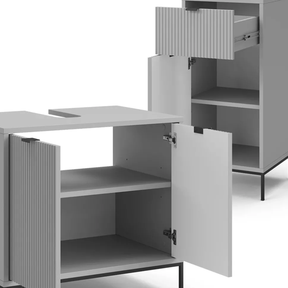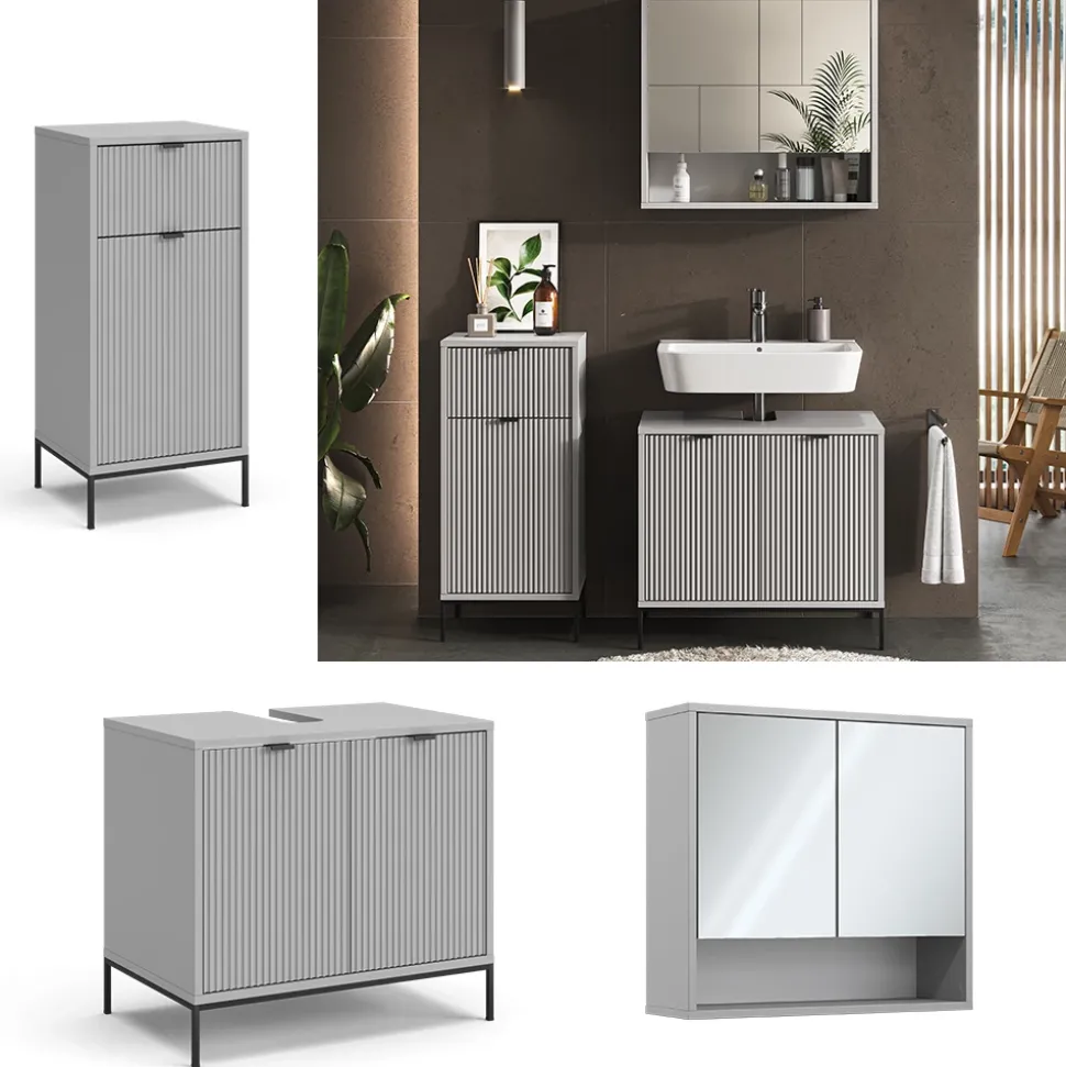 - Entdecken Sie das Vicco Badmöbel-Set Eliza in elegantem Grau. Diese moderne Badserie bietet Stauraum mit extravaganten Fronten – eine perfekte Ergänzung für Ihr Badezimmer.