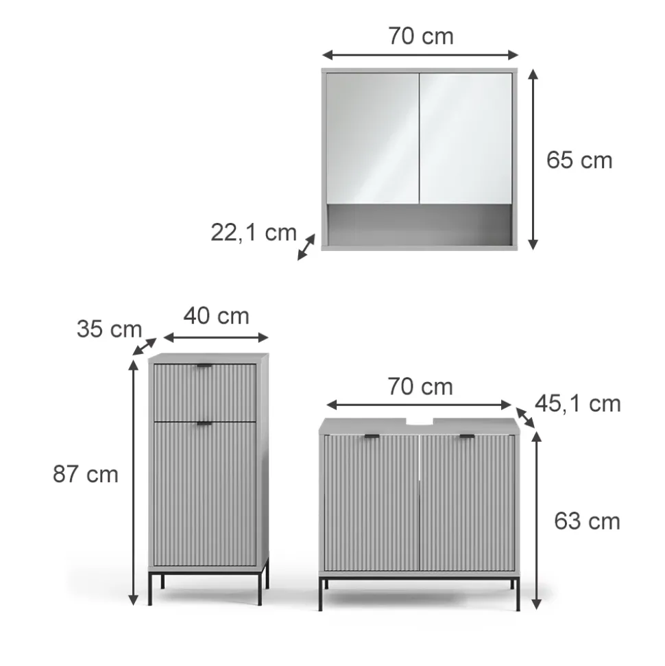 - PRODUKTMAßE: Waschtischunterschrank: 70 x 63 x 45,1 cm, 21,7 kg. Spiegelschrank: 70 x 65 x 22,1 cm, 18,26 kg. Midischrank: 40 x 87 x 35 cm, 18 kg.