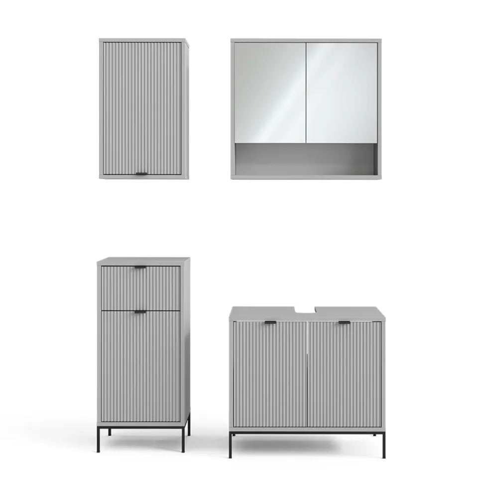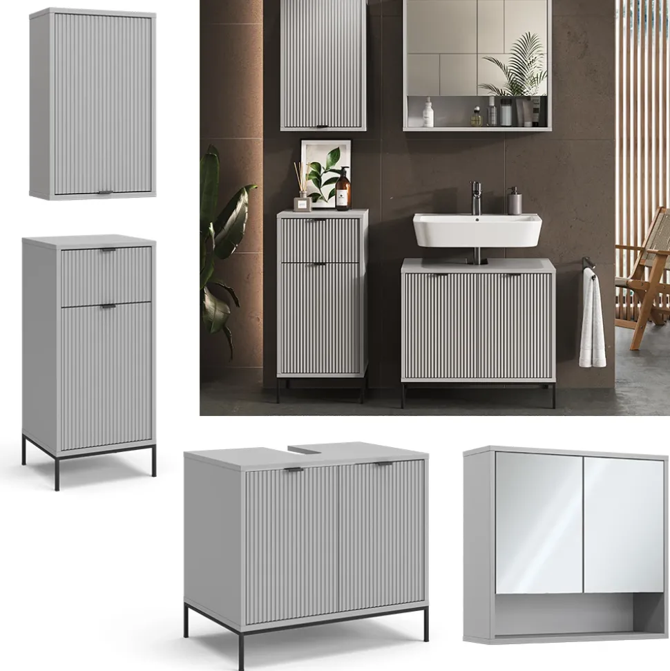 - Entdecken Sie das Vicco Badmöbel-Set Eliza in elegantem Grau. Diese moderne Badserie bietet Stauraum mit extravaganten Fronten – eine perfekte Ergänzung für Ihr Badezimmer.