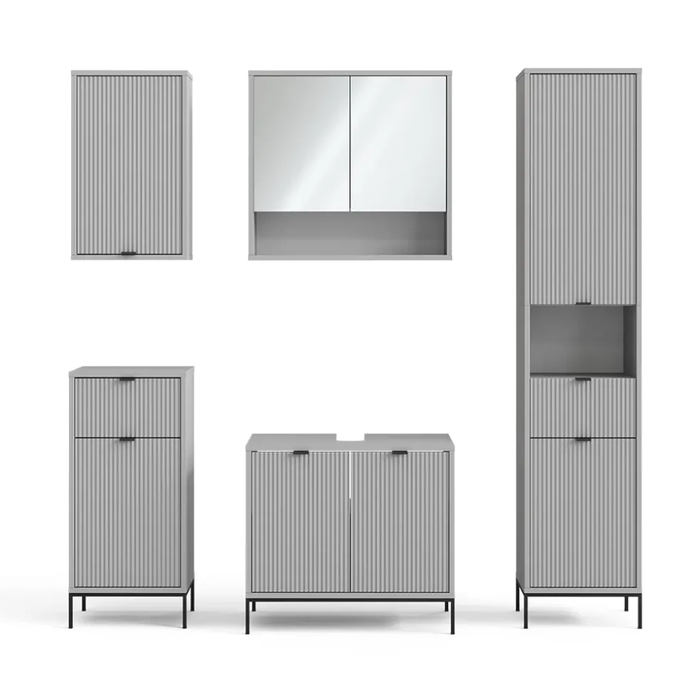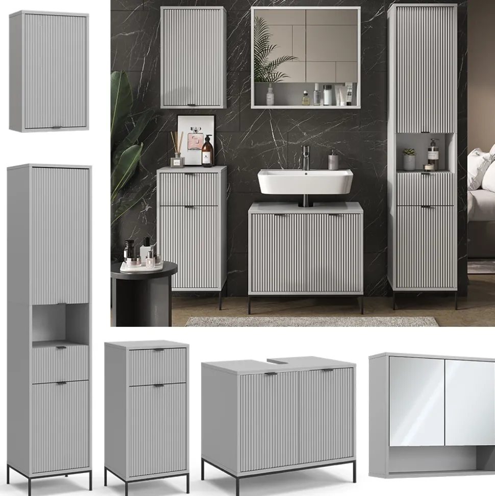 - Entdecken Sie das Vicco Badmöbel-Set Eliza in elegantem Grau. Diese moderne Badserie bietet Stauraum mit extravaganten Fronten – eine perfekte Ergänzung für Ihr Badezimmer.