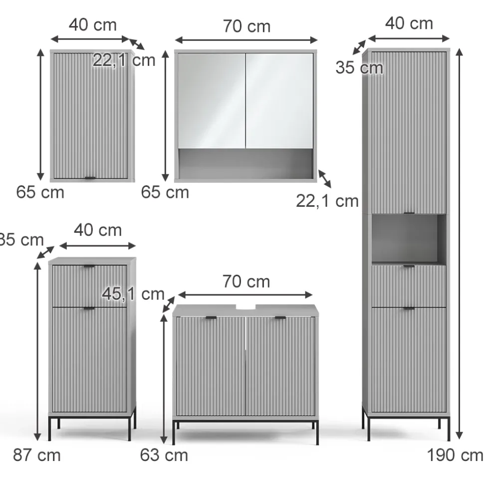 - PRODUKTMAßE: Waschtischunterschrank: 70 x 63 x 45,1 cm, 21,7 kg. Spiegelschrank: 70 x 65 x 22,1 cm, 18,26 kg. Hochschrank: 40 x 190 x 35 cm, 35,9 kg. Midischrank: 40 x 87 x 35 cm, 18 kg.