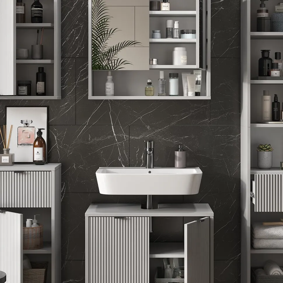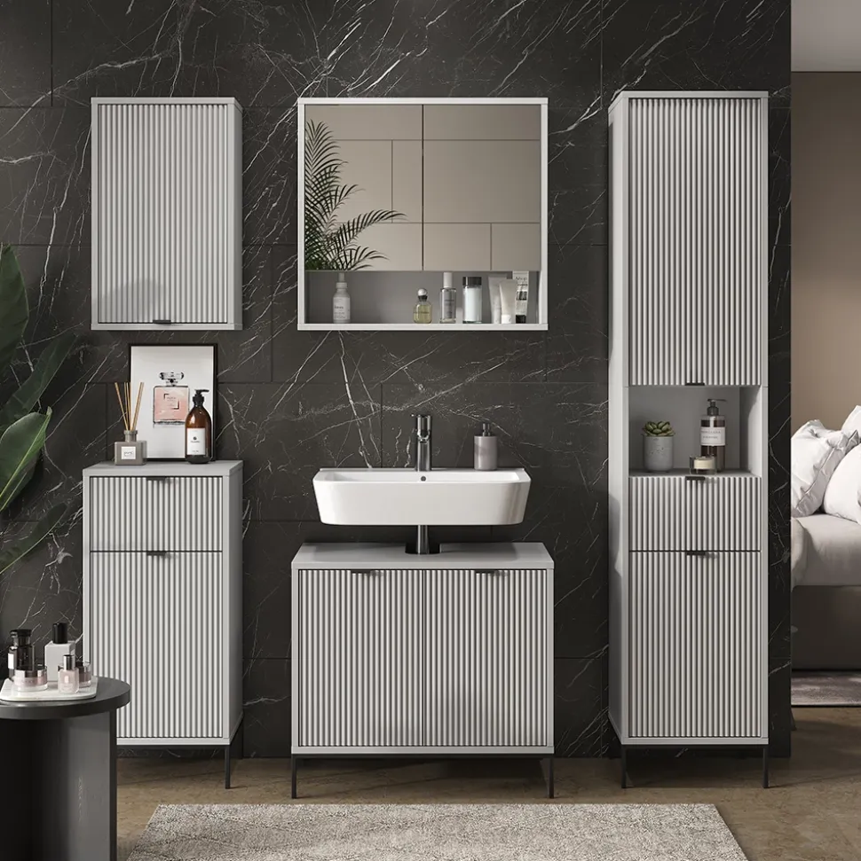 Die vielseitige Möbelserie „Eliza“ bietet stilvolle Badezimmerschränke und -sets, Nachttische, Couchtische und Kommoden. Mit ihrem modernen Design und hochwertigen Materialien schafft „Eliza“ sowohl im Badezimmer als auch im Wohnbereich eine funktionale und ästhetische Umgebung.