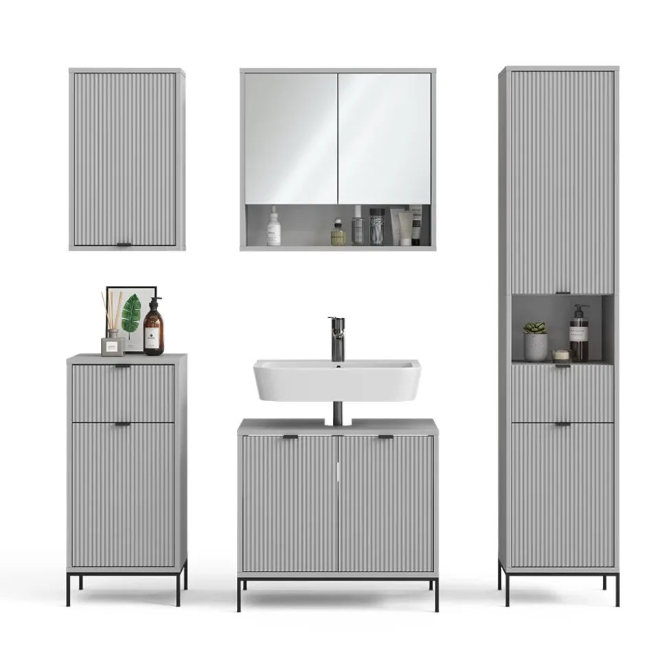 - LIEFERUMFANG: Das Badmöbel-Set enthält einen Spiegelschrank, Hochschrank, Midischrank, Hängeschrank und Waschtischunterschrank