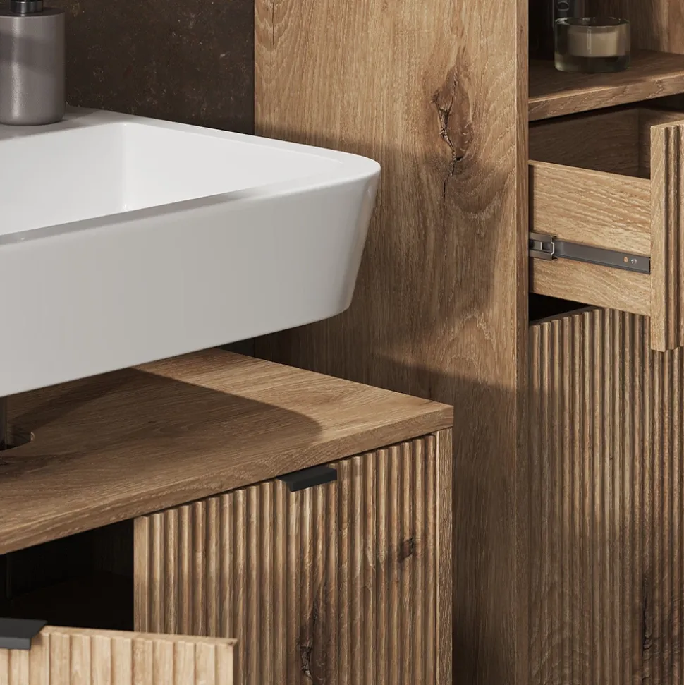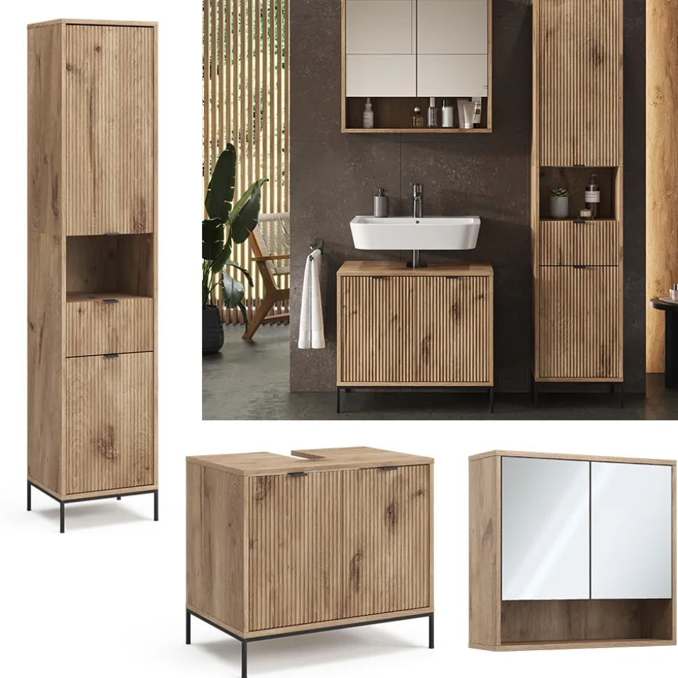 Die vielseitige Möbelserie „Eliza“ bietet stilvolle Badezimmerschränke und -sets, Nachttische, Couchtische und Kommoden. Mit ihrem modernen Design und hochwertigen Materialien schafft „Eliza“ sowohl im Badezimmer als auch im Wohnbereich eine funktionale und ästhetische Umgebung.