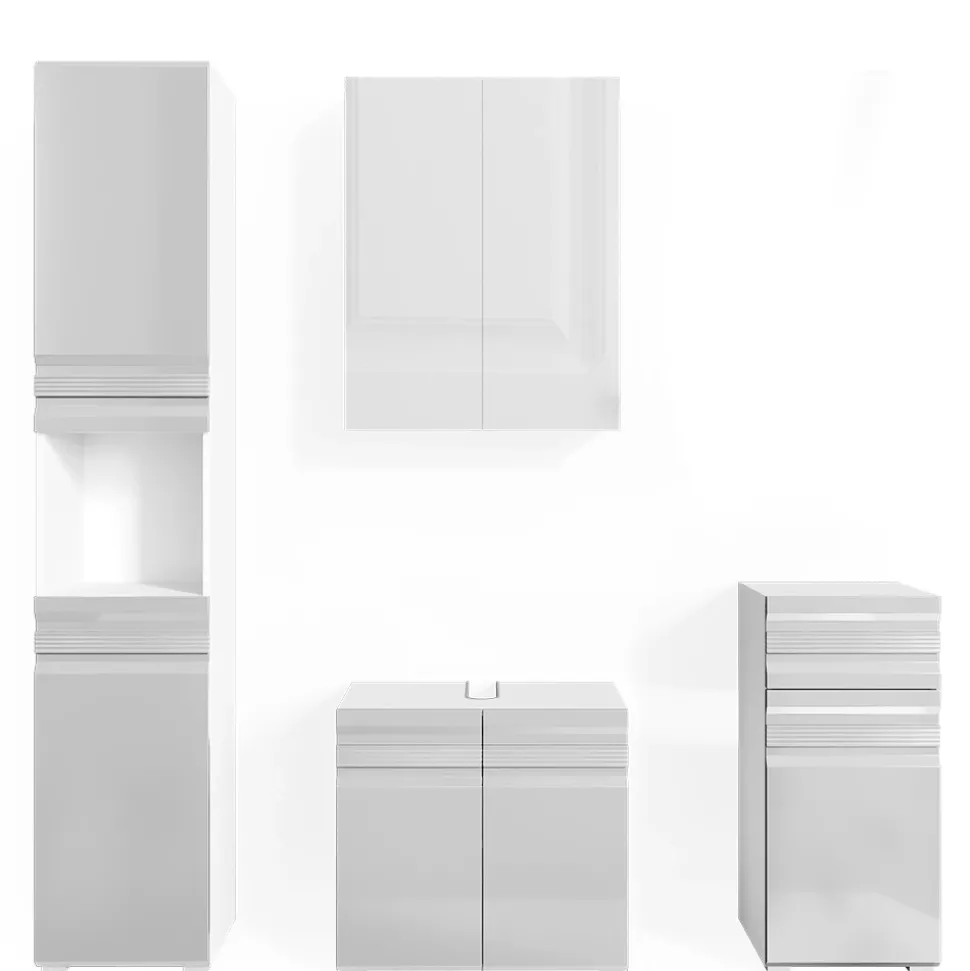 - Das Badezimmerschrank-Set bietet ein griffloses Fassadendesign und ausreichend Stauraum. Verschiedene Sets der Serie können kombiniert werden.