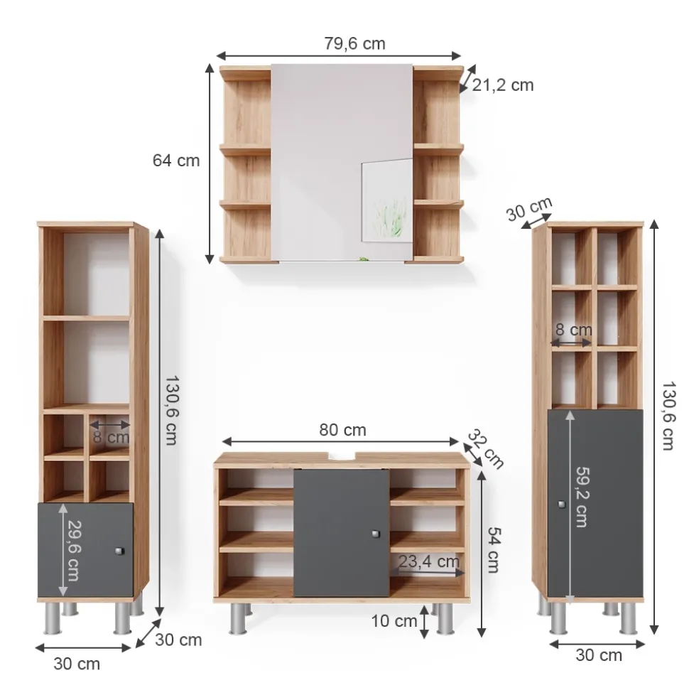 - LIEFERUMFANG: Waschbeckenunterschrank, Bad Spiegelschrank, Hochschrank, Midischrank, Montageanleitung, Montagematerial.