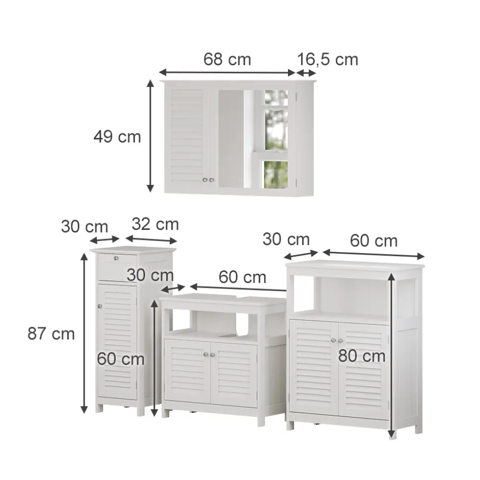 - PRODUKTMAßE: Sideboard: 60 x 80 x 30 cm, 12 kg. Spiegelschrank: 68 x 49 x 16,5 cm, 9,75 kg. Midischrank: 32 x 87 x 30 cm, 8,5 kg. Waschtischunterschrank: 60 x 60 x 30 cm, 9,5 kg (BxHxT).
