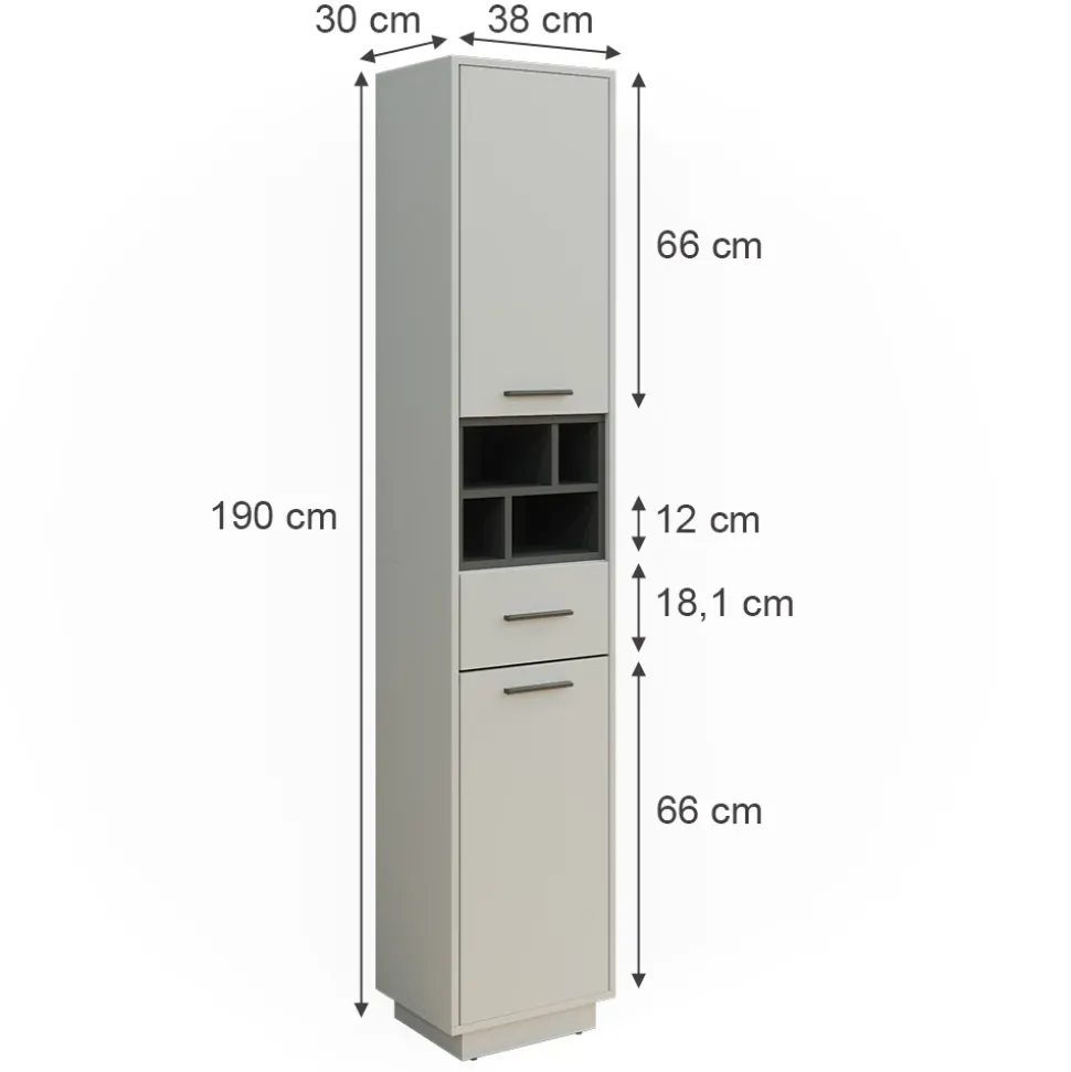 - MAßE: Der Wäscheschrank hat folgende Abmessungen: Breite: 38 cm, Höhe: 190 cm, Tiefe: 30 cm. Alle detaillierten Größen sind auf den Fotos angegeben.