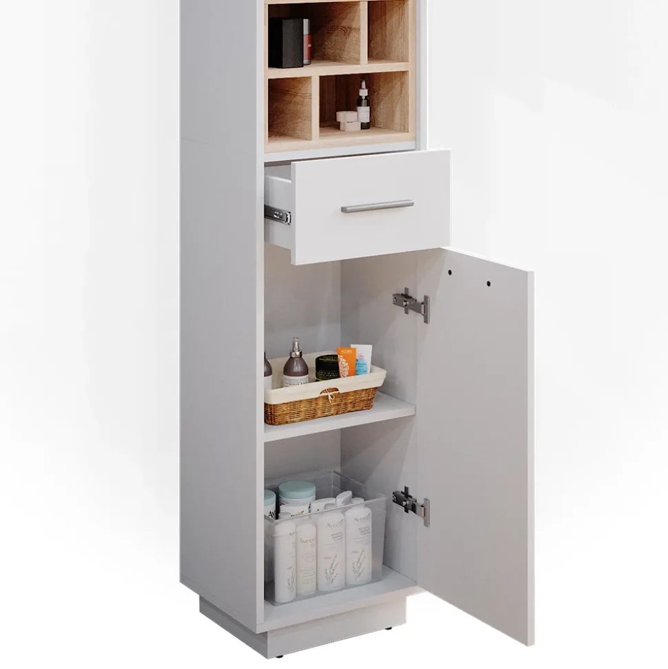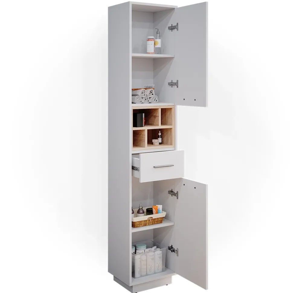 - Dieser Badezimmerhochschrank hat ein offenes Fach und zwei Türen, hinter denen sich vier große und vier kleine Ablagen befinden. Die Schublade ist ausziehbar.
