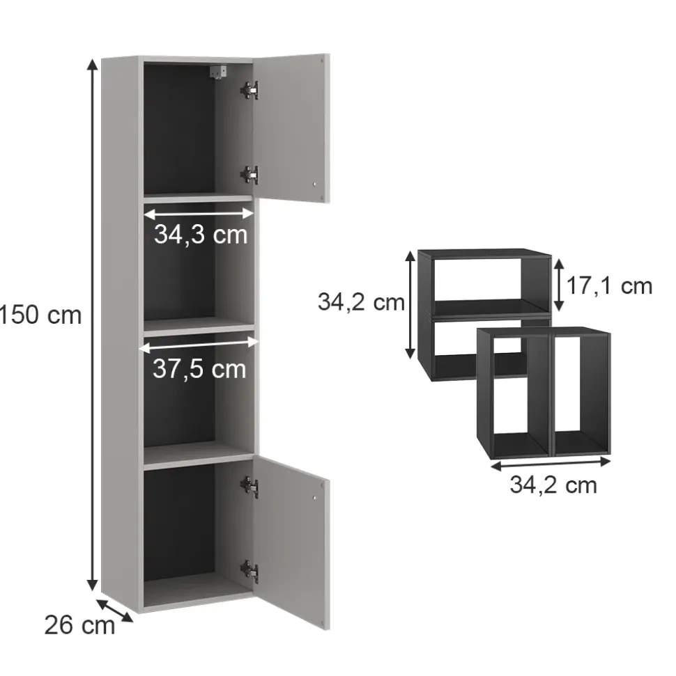 - PRODUKTMAßE: Die Gesamtmaße vom Hängeschrank sind 37,5 x 150 x 26 cm (BxHxT) und er wiegt insgesamt 25,2 kg.