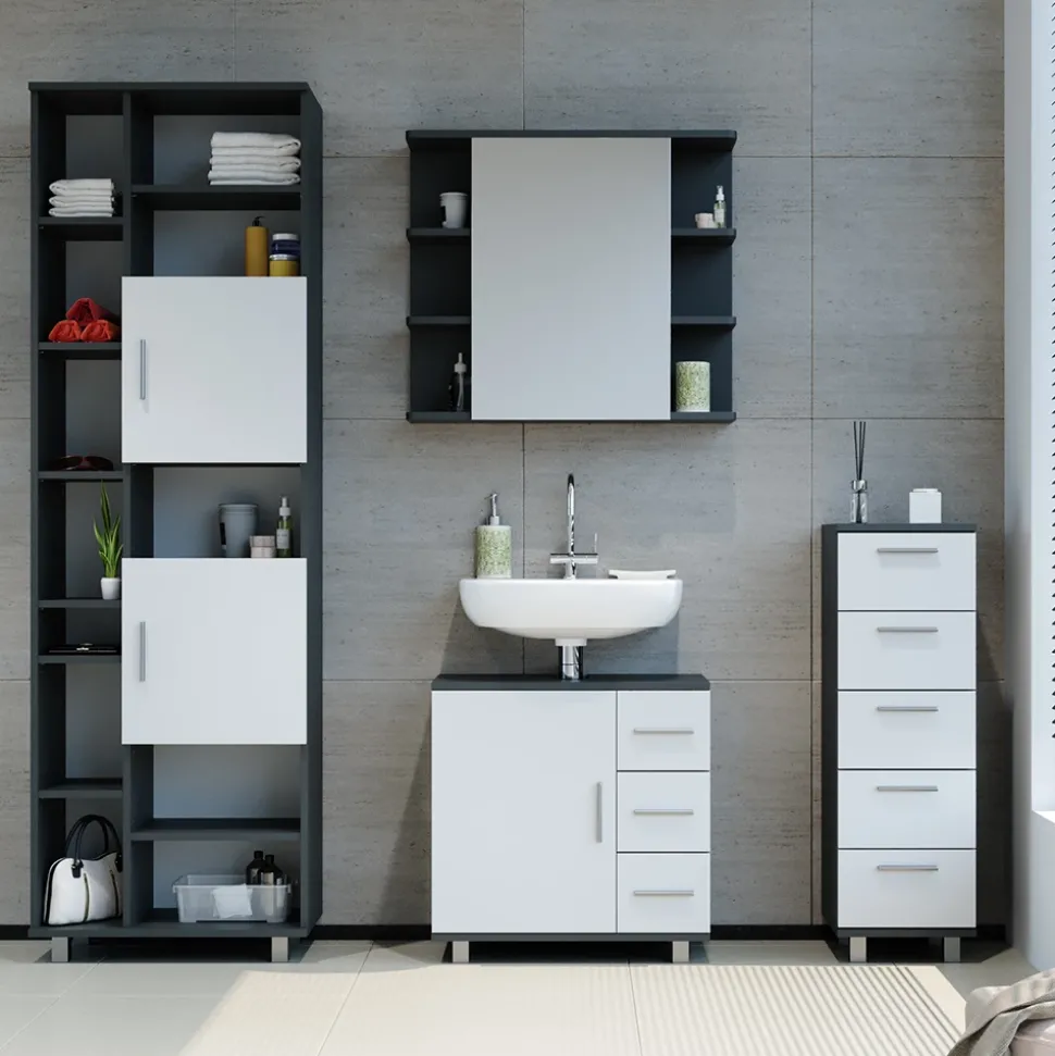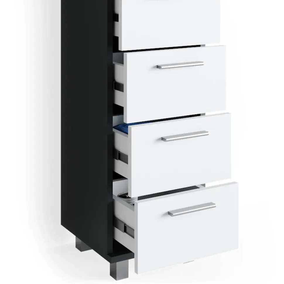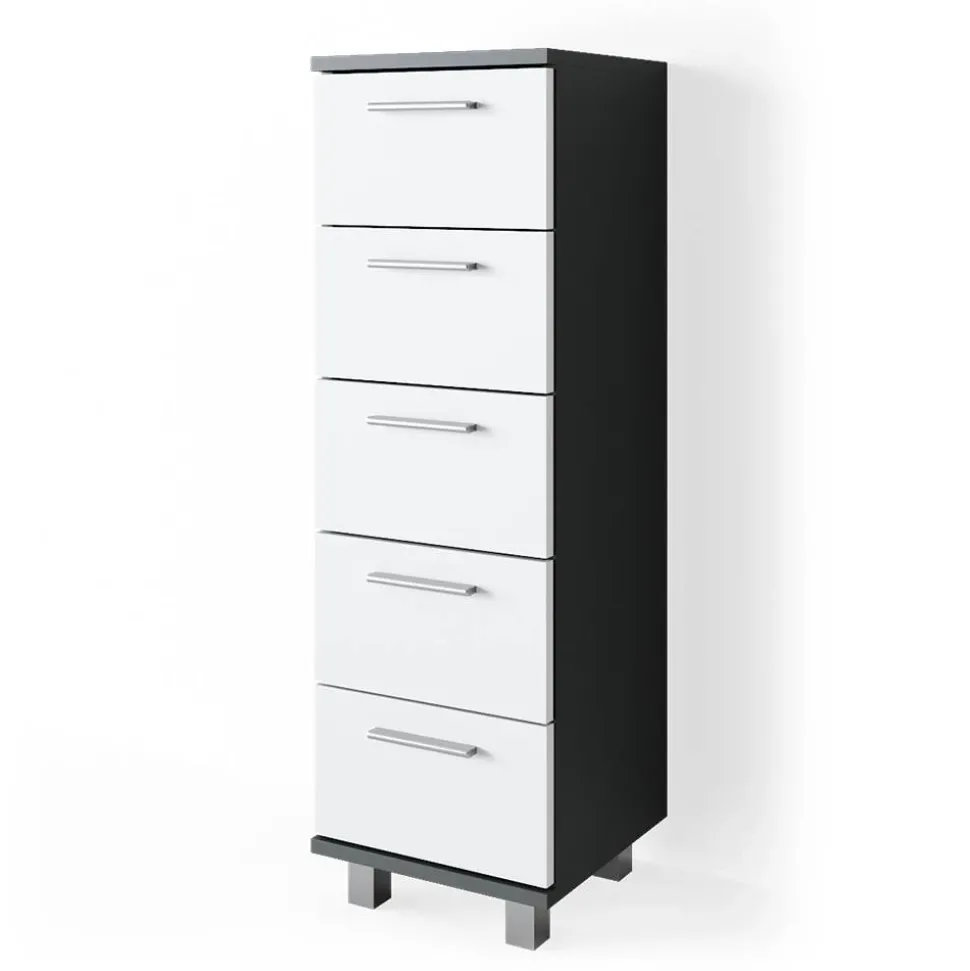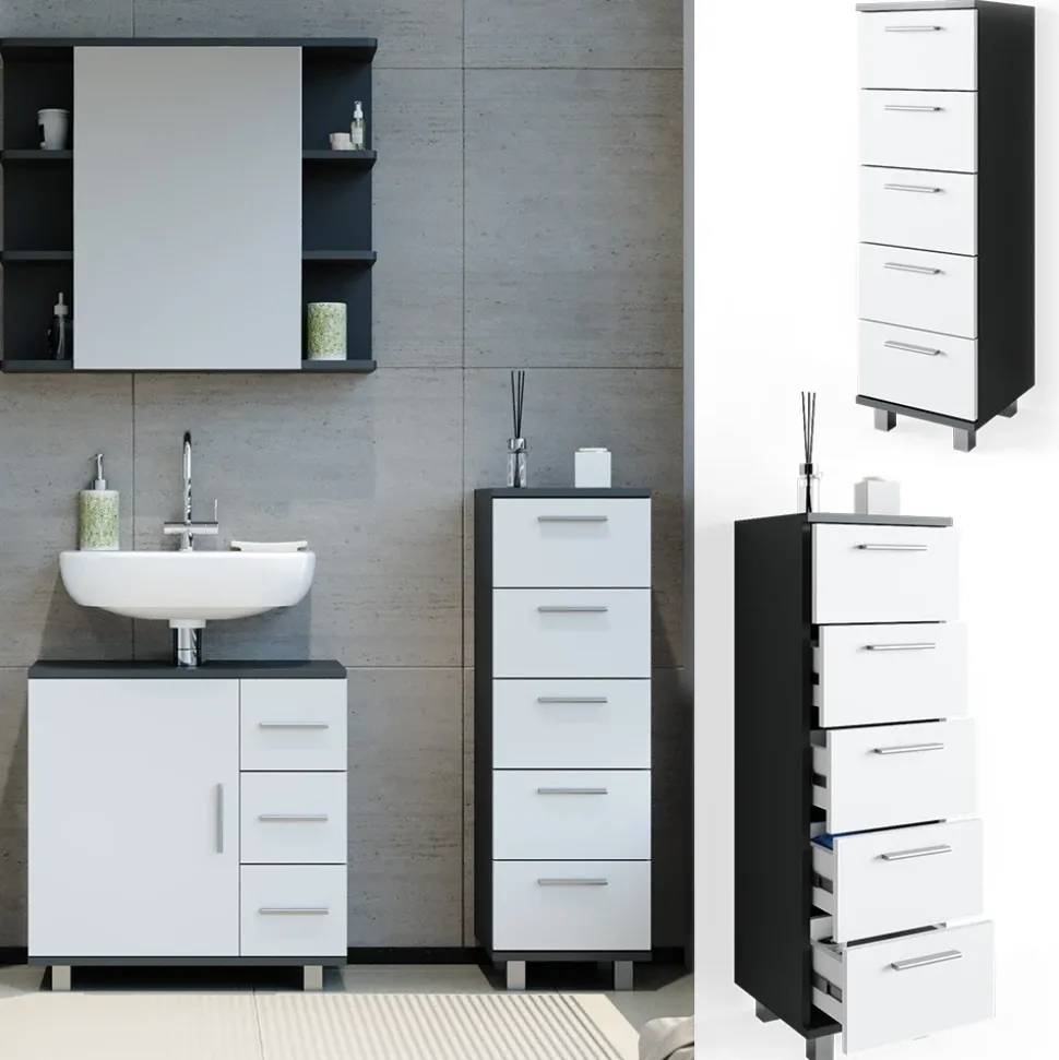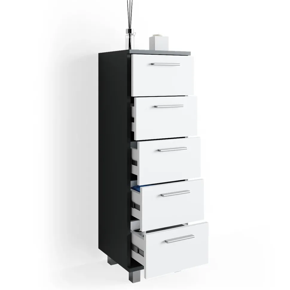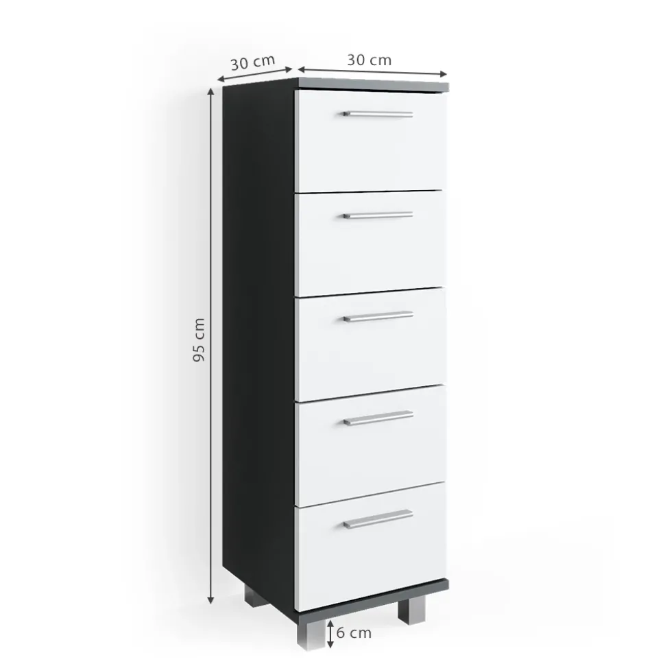 - Das Badezimmerschrank mit Schubladen ist ideal für kleinere Badezimmer. Durch die fünf Schubladen bietet es reichlich Stauraum und ist dabei platzsparend.