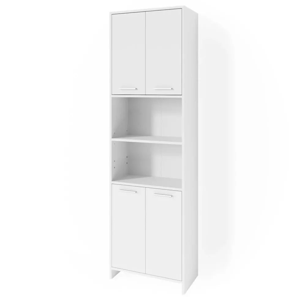 - Der Badezimmerhochschrank verfügt über zwei offene Ablagen und vier Türen mit sechs geschlossenen Regale für maximalen Stauraum.