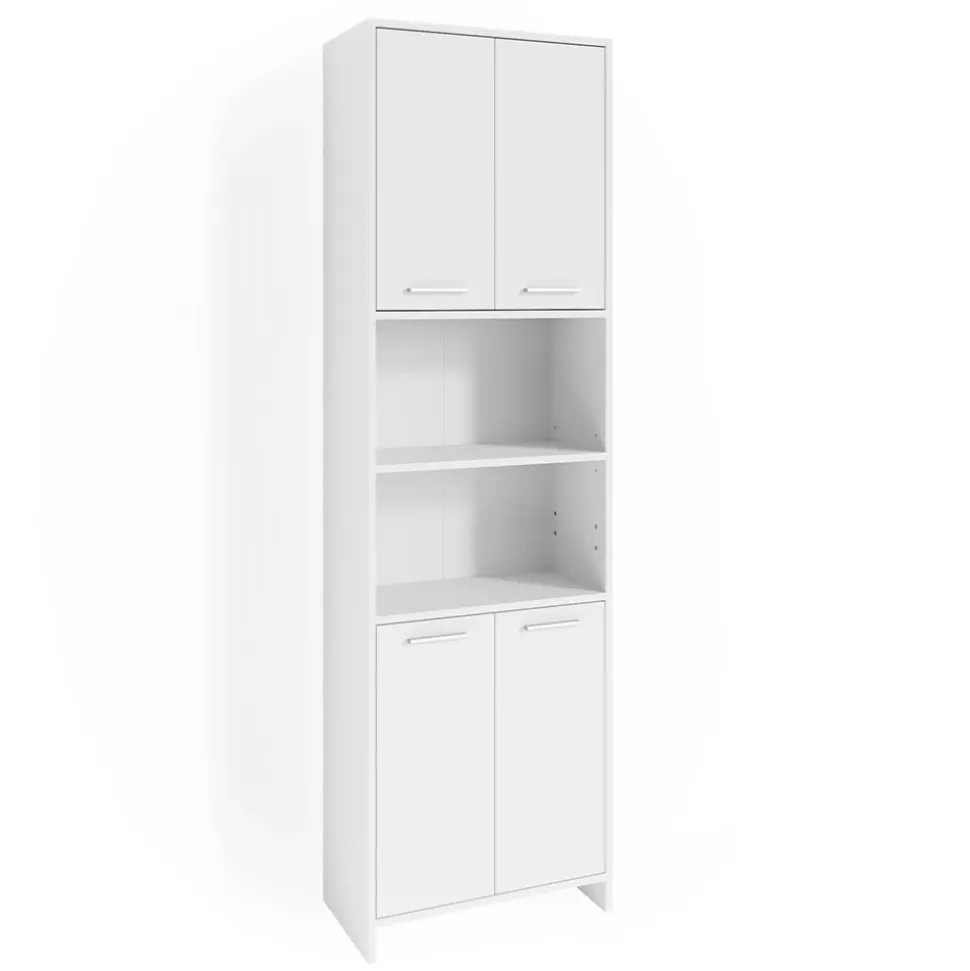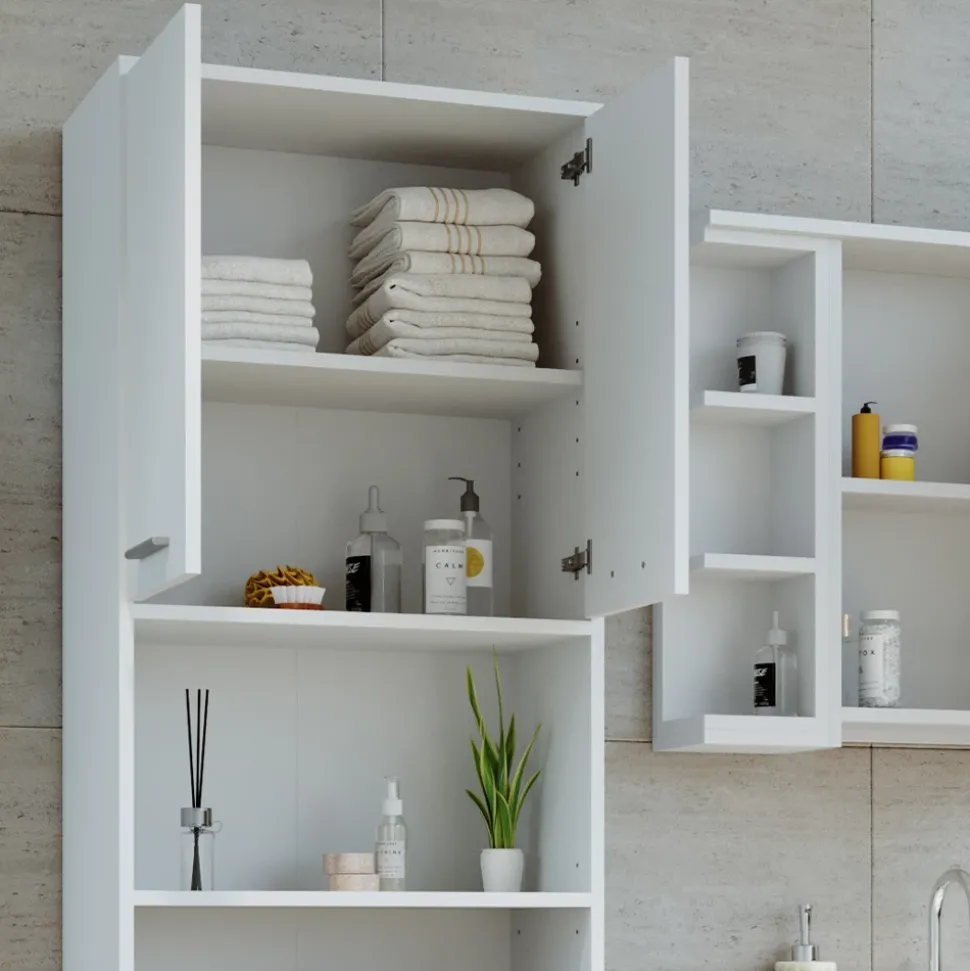 - Der Badezimmerhochschrank verfügt über zwei offene Ablagen und vier Türen mit sechs geschlossenen Regale für maximalen Stauraum.