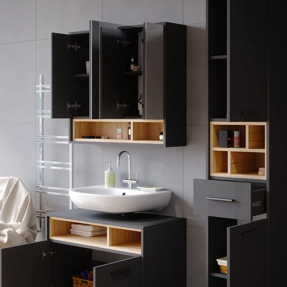 - Dieser Badezimmer-Spiegelschrank verfügt über drei Spiegeltüren und offene Regale mit reichlich Stauraum. Er ist ideal für das Aufbewahren von Badutensilien und Kosmetika.