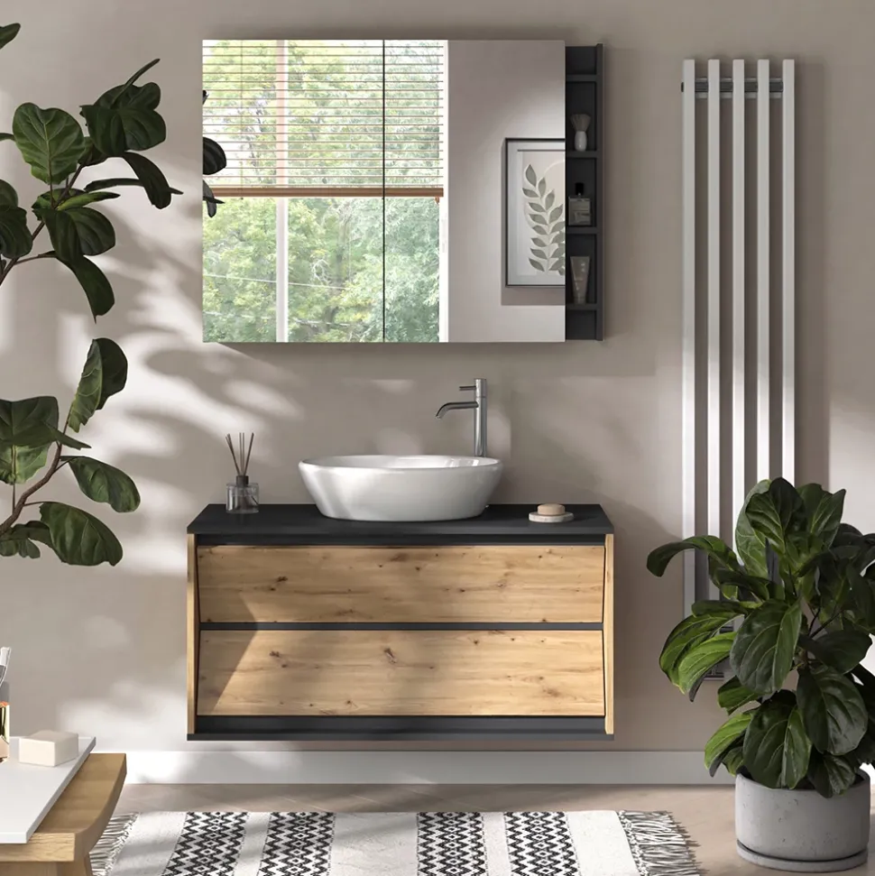 - MATERIAL: Der Badezimmer-Spiegelschrank Edelin besteht aus 16mm Spanplatte mit Melaminharzbeschichtung und Glas, die leicht zu pflegen sind.