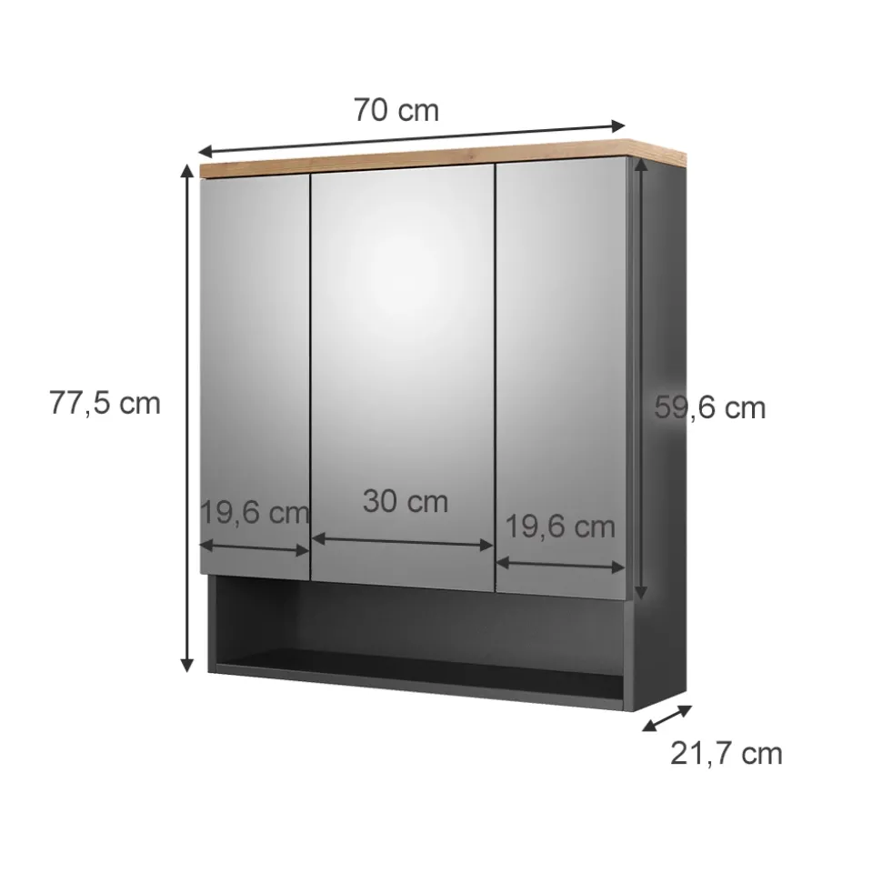 - MAßE: Der Badezimmerschrank mit Spiegel hat eine Breite von 70 cm, eine Höhe von 77 cm und eine Tiefe von 22 cm. Alle detaillierten Größen sind auf den Fotos angegeben.