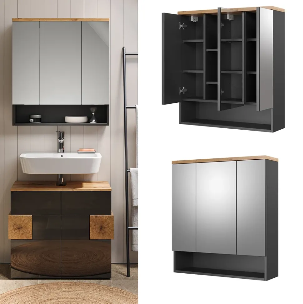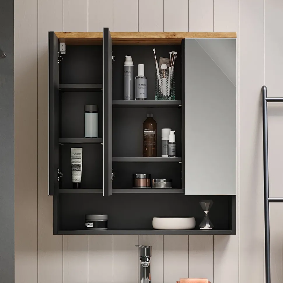 - Der Badezimmerspiegel bietet 3 verspiegelte Türen und ein offenes Regal für reichlich Stauraum.