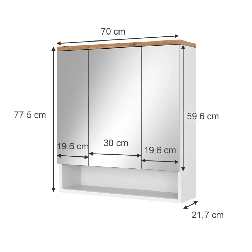 - MAßE: Der Badezimmerschrank mit Spiegel hat folgende Abmessungen: Breite: 70 cm, Höhe: 77,5 cm, Tiefe: 21,7 cm. Alle detaillierten Größen sind auf den Fotos angegeben.