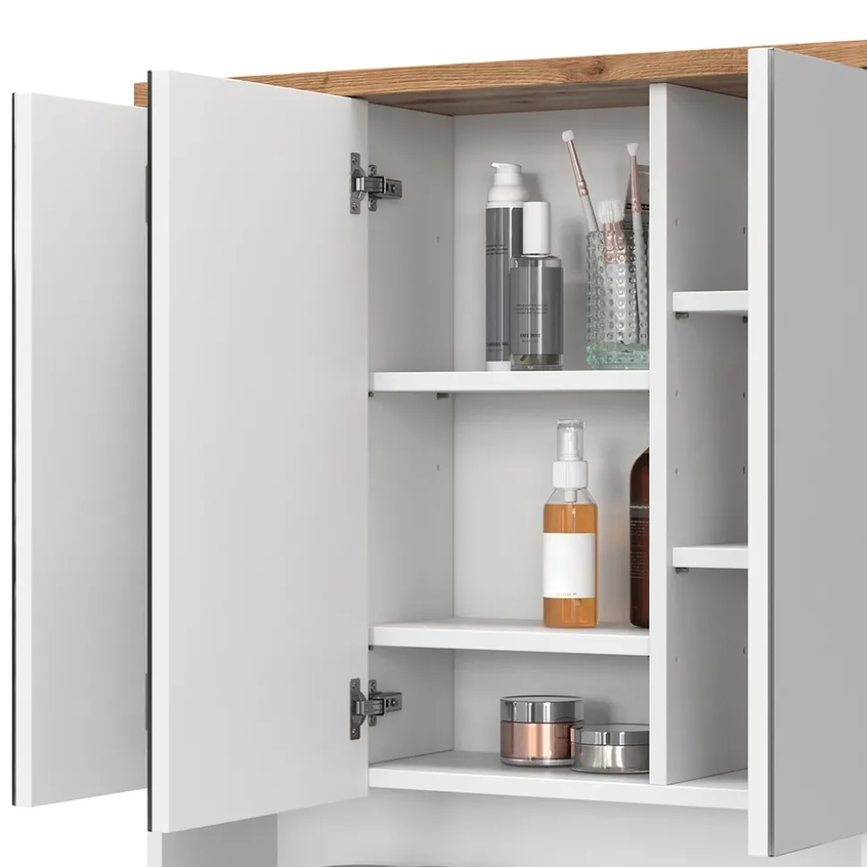 - Dieser Badezimmerspiegel bietet offene Ablageflächen und höhenverstellbare Einlegeböden. Zusätzlich gibt es geschlossene Fächer für zusätzlichen Stauraum.