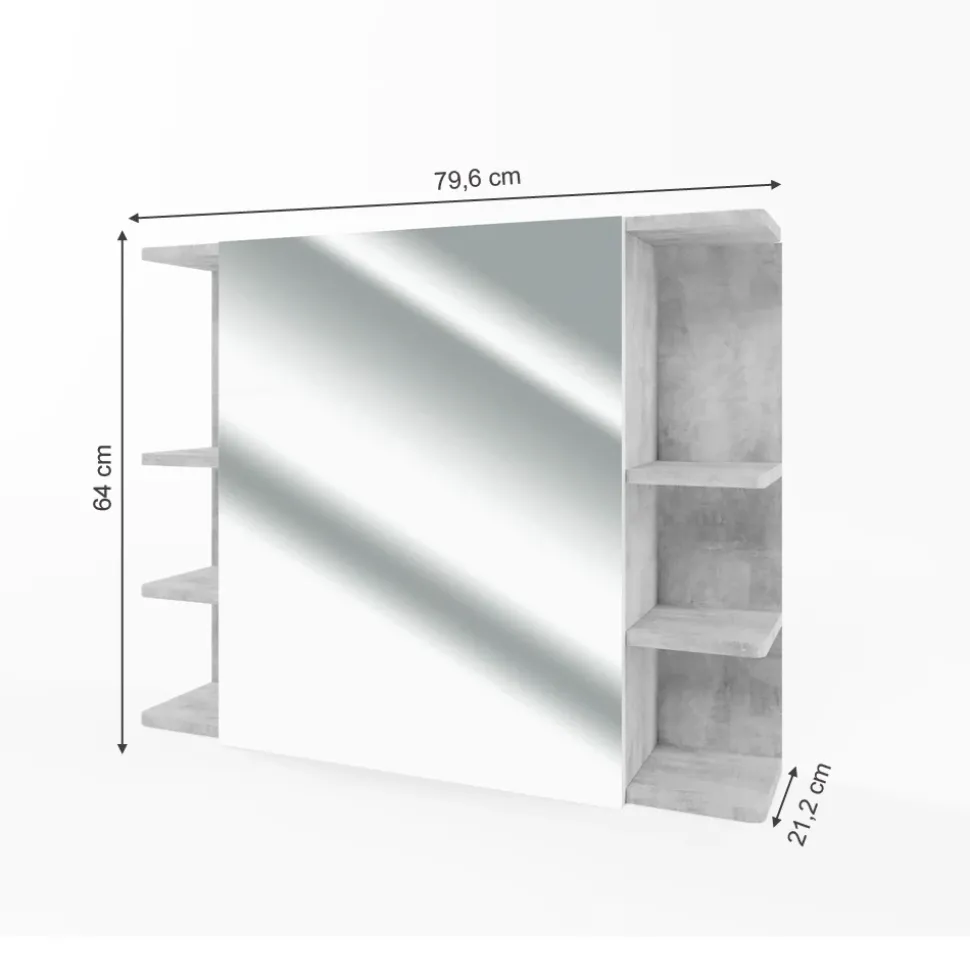 - MAßE: Der Badezimmerschrank mit Spiegel hat eine Breite von 80 cm, eine Höhe von 64 cm und eine Tiefe von 21 cm. Alle detaillierten Größen sind auf den Fotos angegeben.