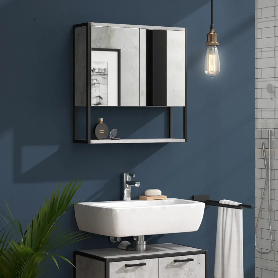 - Dieser Badezimmerspiegel bietet mit seinen zwei Spiegeltüren und zwei inneren Ablageflächen viel Stauraum. Er eignet sich perfekt für kleinere Badezimmer.