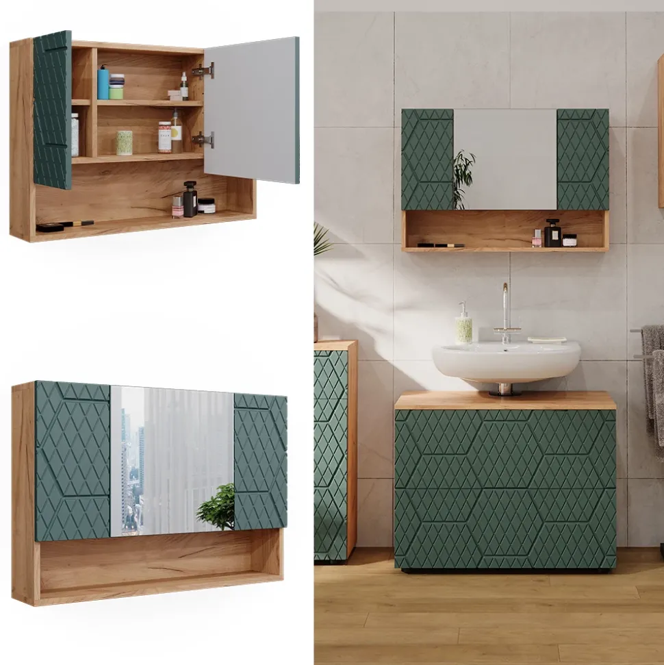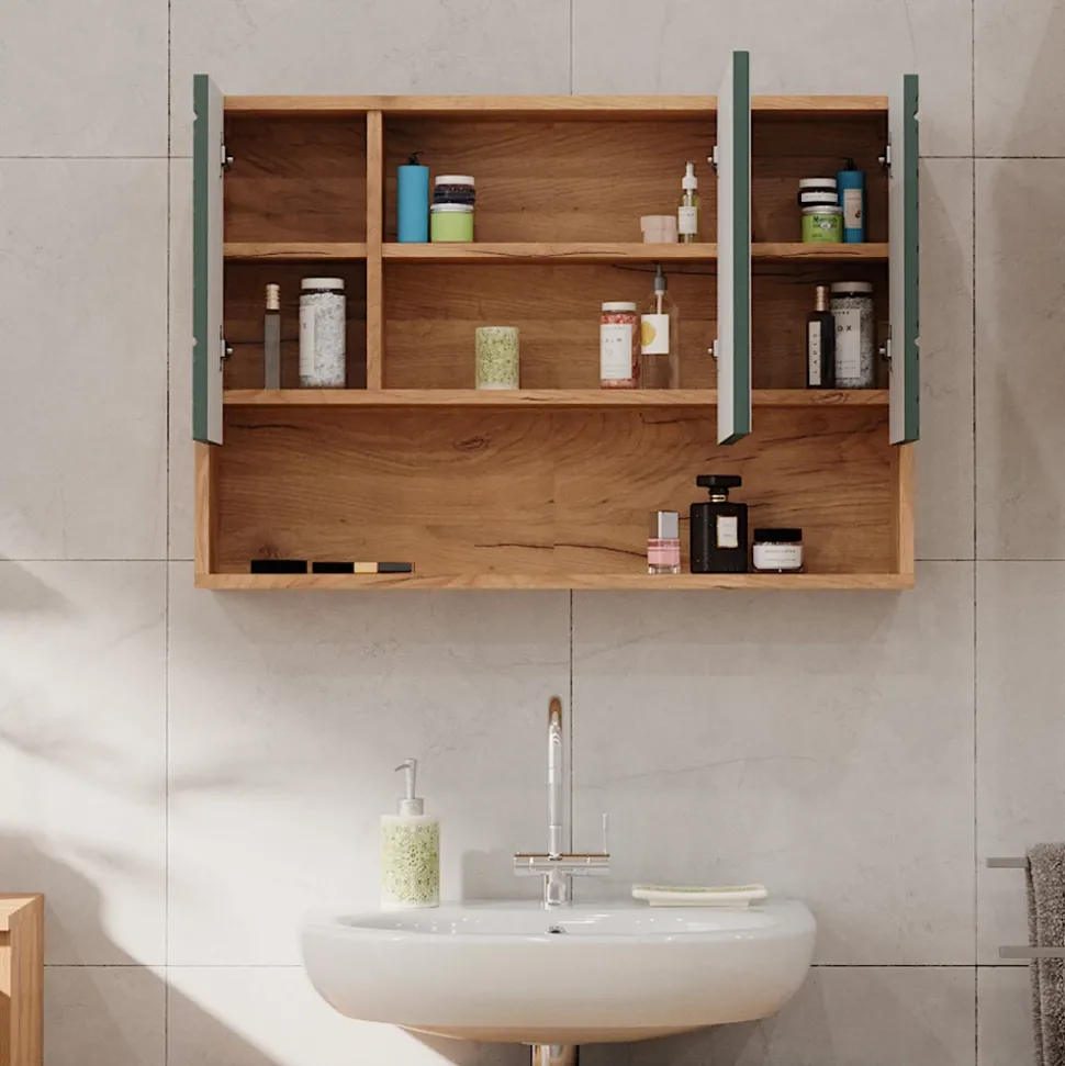 - Der Badezimmerspiegel ist platzsparend und bietet dennoch reichlich Stauraum. Die offenen und geschlossenen Ablagefächer sorgen für zusätzliche Flexibilität.