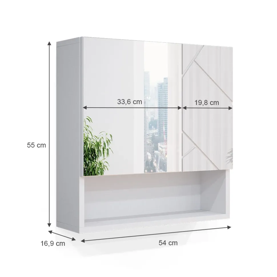 - MAßE: Der Badezimmerschrank mit Spiegel hat eine Breite von 54 cm, eine Höhe von 55 cm und eine Tiefe von 17 cm. Alle detaillierten Größen sind auf den Fotos angegeben.