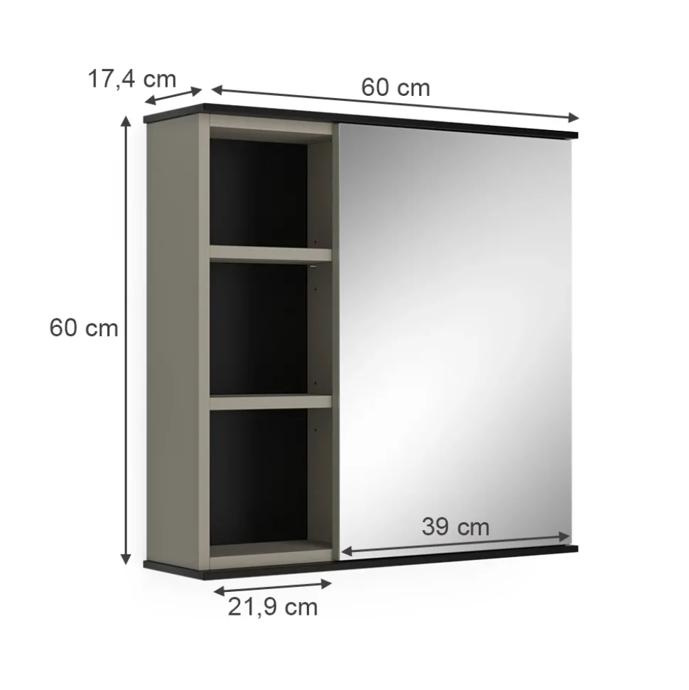 - MAßE: Der Badezimmerschrank mit Spiegel hat eine Tiefe von 17,4 cm, eine Breite von 60 cm und eine Höhe von 60 cm.