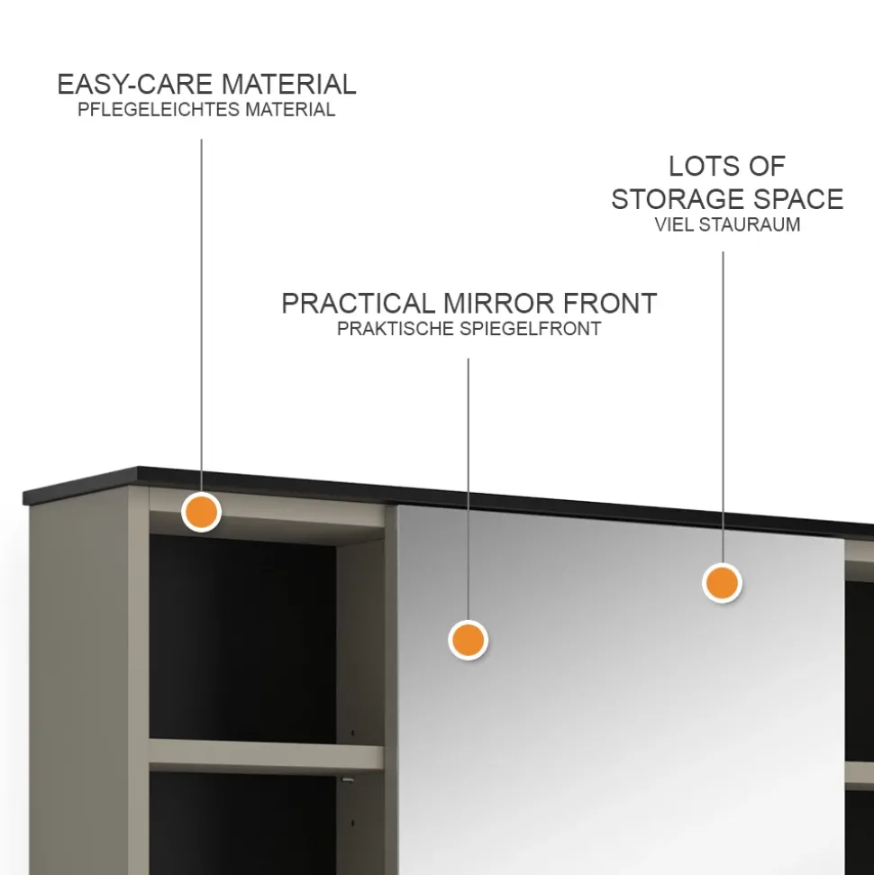 - MATERIAL: Der Badspiegelschrank besteht aus pflegeleichter Spanplatte, 16 mm.