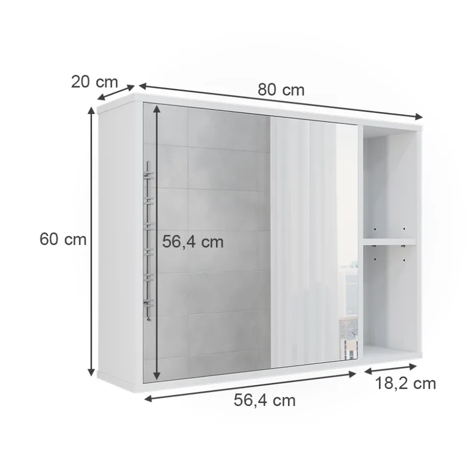- MAßE: Der Badezimmerschrank mit Spiegel, Tiefe: 20 cm, Breite: 80 cm, Höhe: 60 cm. Die detaillierten Größen sind auf den Fotos angegeben.