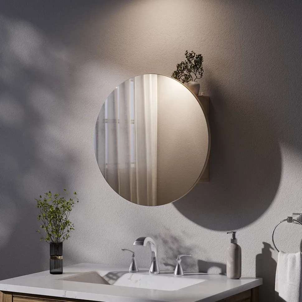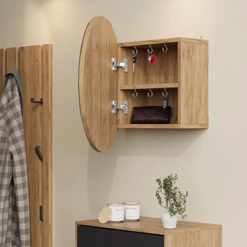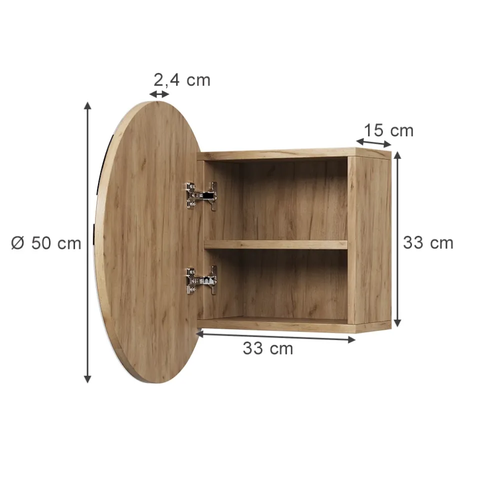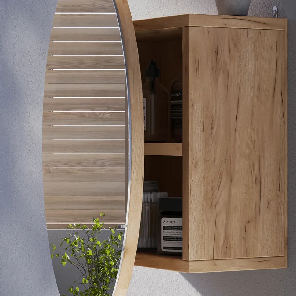 Der Spiegelschrank Loki überzeugt mit seinem modernen, runden Design und einer eleganten Antik-Optik. Er bietet nicht nur stilvolle Aufbewahrung, sondern setzt auch einen dekorativen Akzent im Badezimmer.