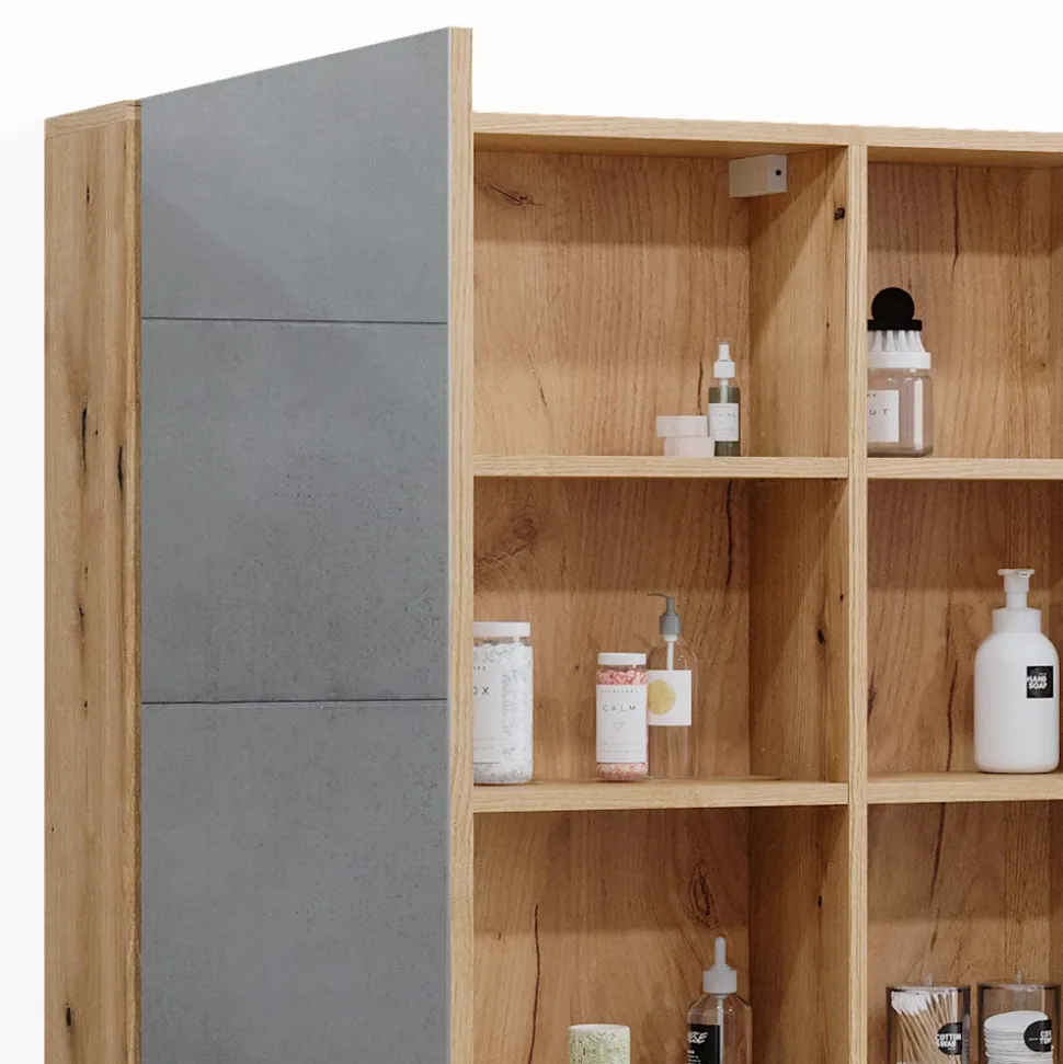 Entdecken Sie viel Stauraum im stilvollen Spiegelschrank, der Ihnen praktischen Platz für Ihre Badutensilien bietet. Lassen Sie sich von der Rudi-Serie, die Ihnen vielseitige Möbel für Ihr Badezimmer bietet, inspirieren – darunter der praktische Spiegelschrank. Halten Sie alles griffbereit mit den offenen Fächern. Eine elegante Möglichkeit, Ihre Badartikel ordentlich zu organisieren. Genießen Sie die pflegeleichte Oberfläche des Spiegelschranks Rudi, welche Ihnen eine mühelose Reinigung und langanhaltende Schönheit ermöglicht. Der Spiegelschrank ist Bestandteil unserer Rudi-Badmöbelserie.