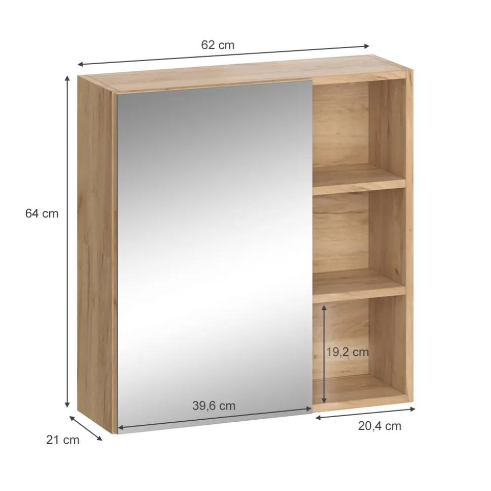 - MAßE: Der Badezimmerschrank mit Spiegel hat eine Breite von 62 cm, eine Höhe von 64 cm und eine Tiefe von 21 cm. Alle detaillierten Größen sind auf den Fotos angegeben.