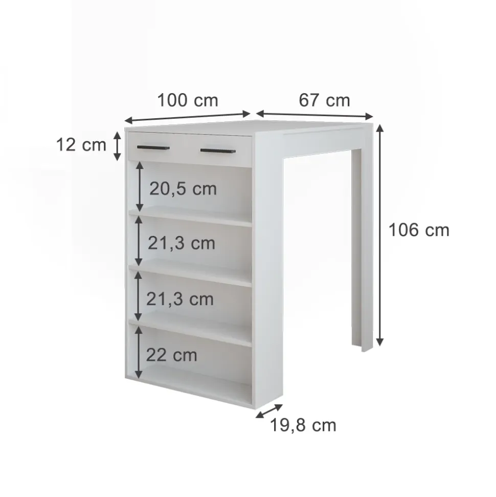 - MAßE: Der Stehtisch für die Küche – als Bartisch nutzbar – hat eine Tiefe von 100 cm, eine Breite von 67 cm und eine Höhe von 106 cm.