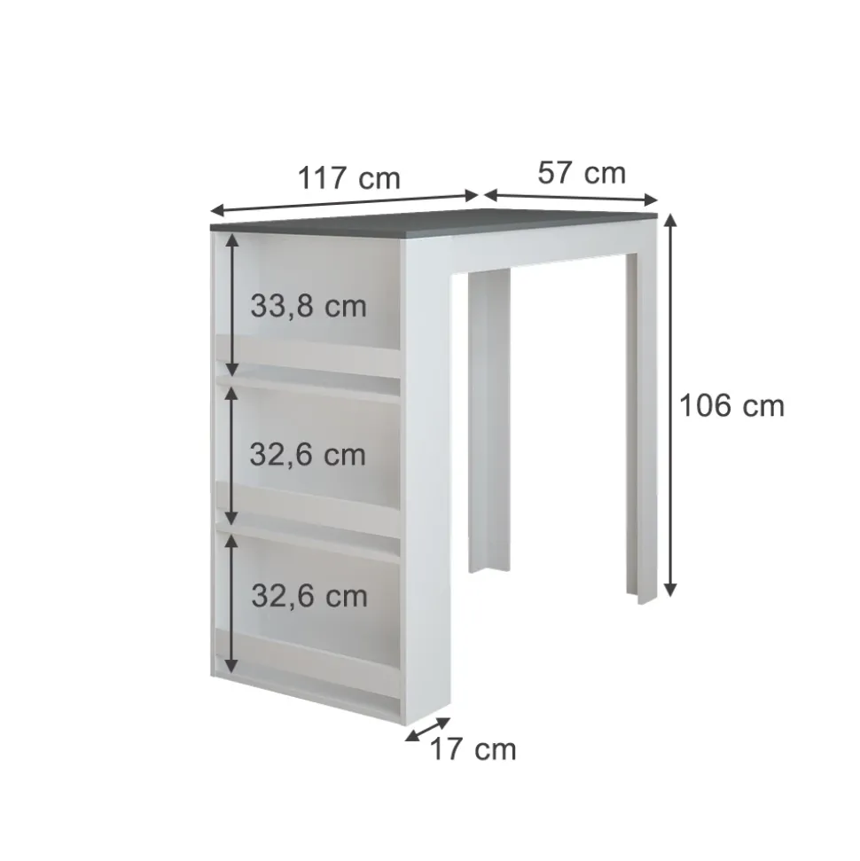 - MAßE: Der Stehtisch für die Küche misst 117 cm in der Tiefe, 57 cm in der Breite und 106 cm in der Höhe.