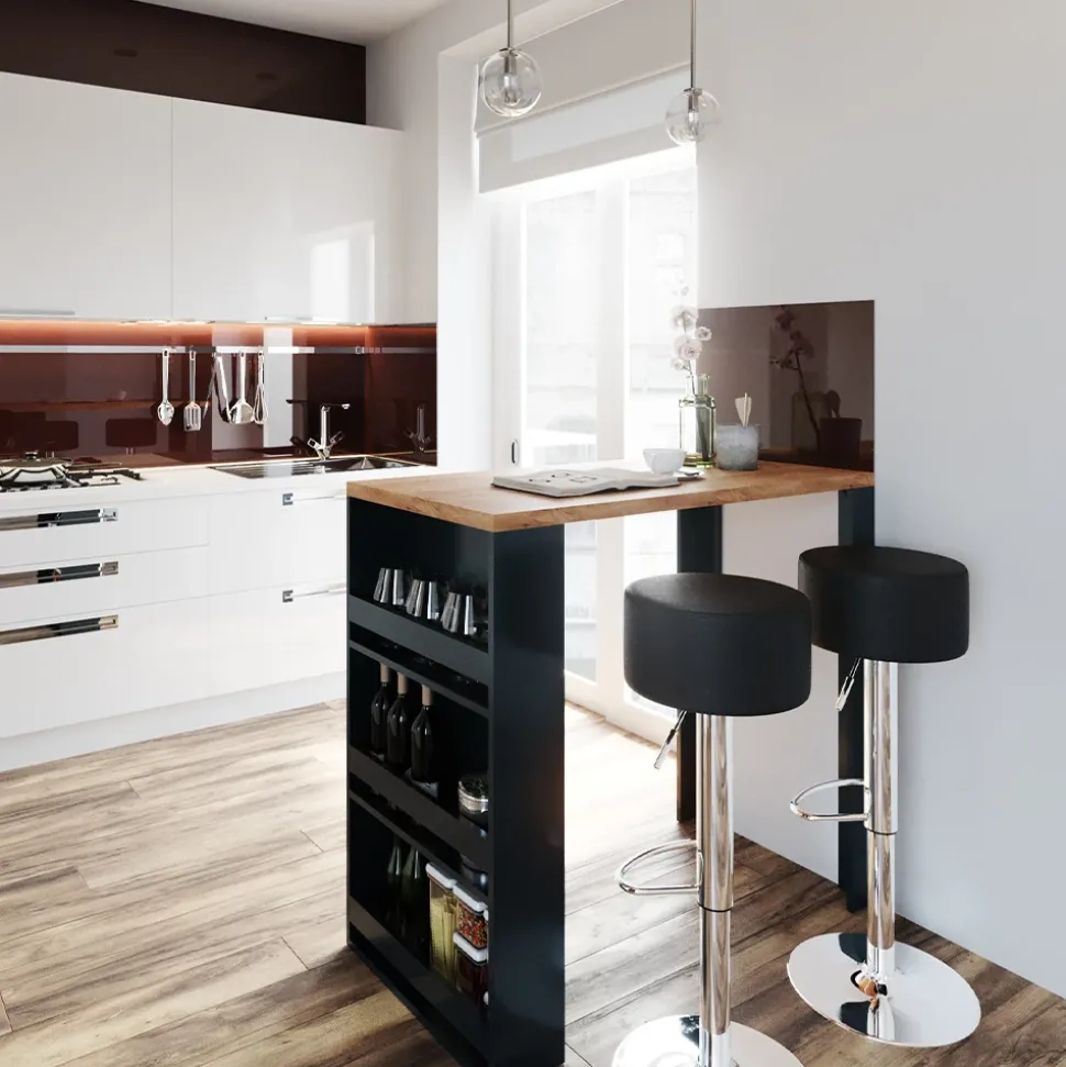 - Der Bartresen und Hocker bietet viele offene Ablagen zur Aufbewahrung von Küchenutensilien. Er ist funktional, geräumig und eine fertige Lösung für die Küche.
