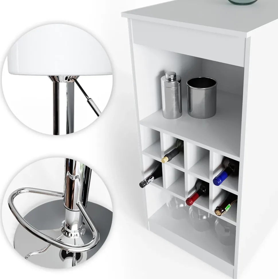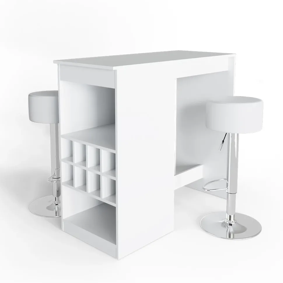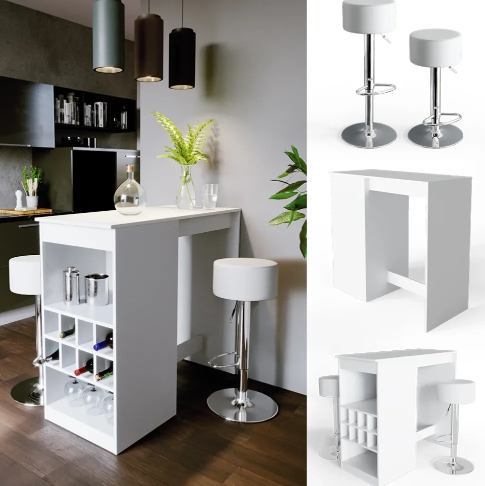 - Der Bartresen und Hocker sind eine funktionelle und geräumige Lösung für die Küche, mit offenen Flaschenfächern für einen schnellen Zugriff auf Getränke.